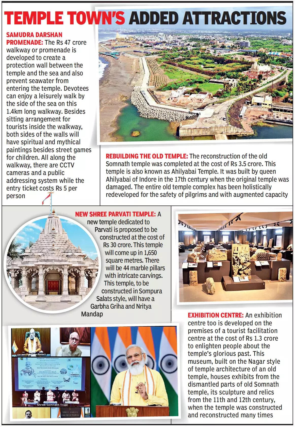 Modi, who is also the chairman of Shree Somnath Trust, said, “This temple was demolished several times over several centuries in the past. Idols of deities were also desecrated. Attempts were made to erase its existence all together. But it came up again in its full glory every time it was destroyed.” Recalling the contribution of India’s ‘Iron Man’ Sardar Vallabhbhai Patel in building the present Somnath temple, the PM also paid tributes to India’s first President Dr Rajendra Prasad and freedom fighter frm Gujarat Kanaiyalal Munshi who played pivotal roles in its construction. Modi inaugurated projects worth Rs 83 crore which included a 1.4-km long ‘Samudra Darshan’ promenade, a newlybuilt museum housing ancient artefacts and the renovated Juna Somnath temple (also called Ahilyabai Holkar Temple), besides performing the ground-breaking ceremony for a Parvati Temple.
