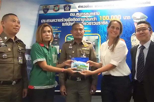 An employee of a convenience store at a petrol station in Samut Songkhram has been praised for returning 100,000 baht in cash to a Brazilian woman who left an envelope containing the money at the counter before travelling on a van to a tourist venue.