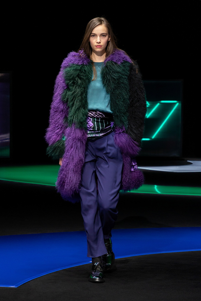 In a video presented at the virtual Milan Fashion Week on Thursday, models wore wide-leg trousers with suspenders, velvet jumpsuits and round-shouldered jackets and coats, some with boule buttons, others with shiny patterns.