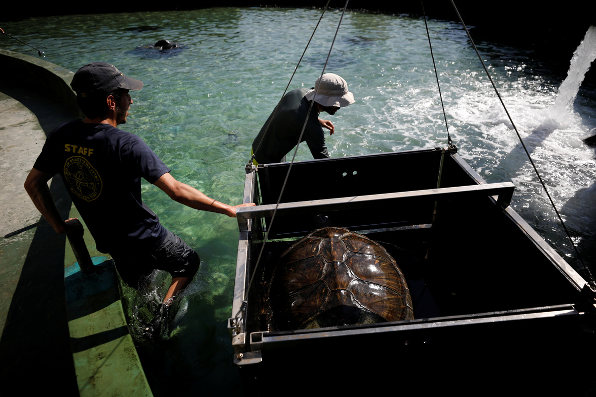 Researchers prepare to lift a green sea turtle out of a pool in order to clean the pool at the Israeli Sea Turtle Rescue Center, in Mikhmoret north of Tel Aviv, Israel September 23, 2019. REUTERS/Amir Cohen