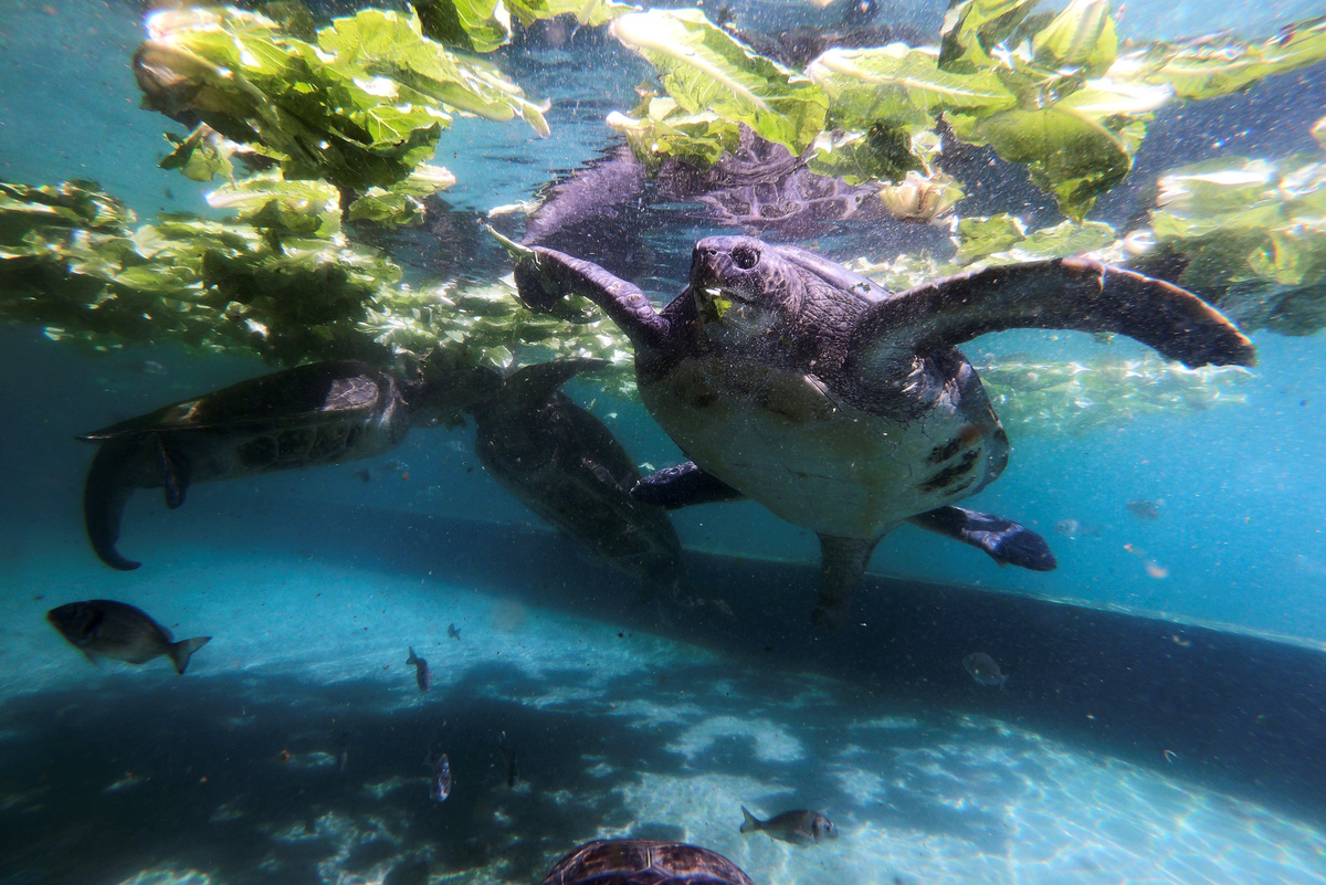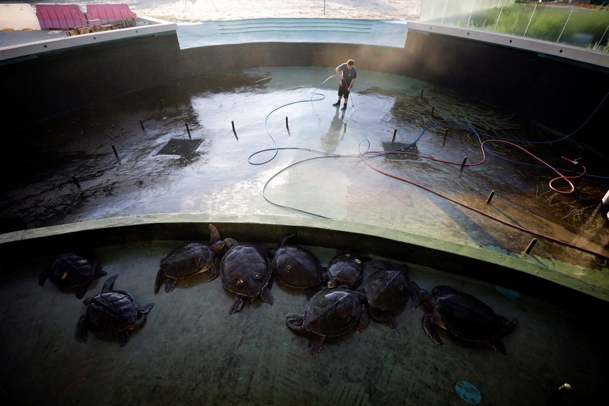 Green sea turtles are seen in a section of a pool as a staff member cleans another section at the Israeli Sea Turtle Rescue Center, in Mikhmoret north of Tel Aviv, Israel September 23, 2019. REUTERS/Amir Cohen