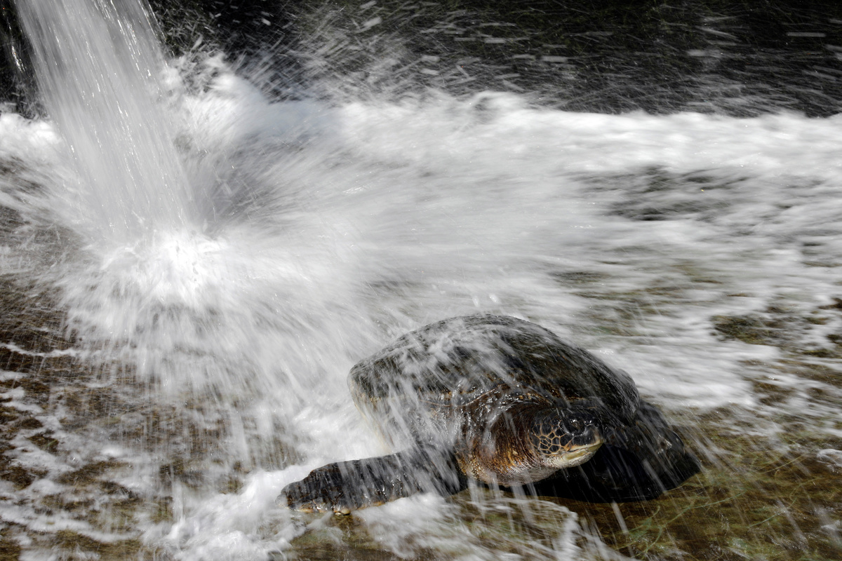A green sea turtle is seen as water splashes next to it inside a pool at the Israeli Sea Turtle Rescue Center, in Mikhmoret north of Tel Aviv, Israel September 23, 2019. REUTERS/Amir Cohen