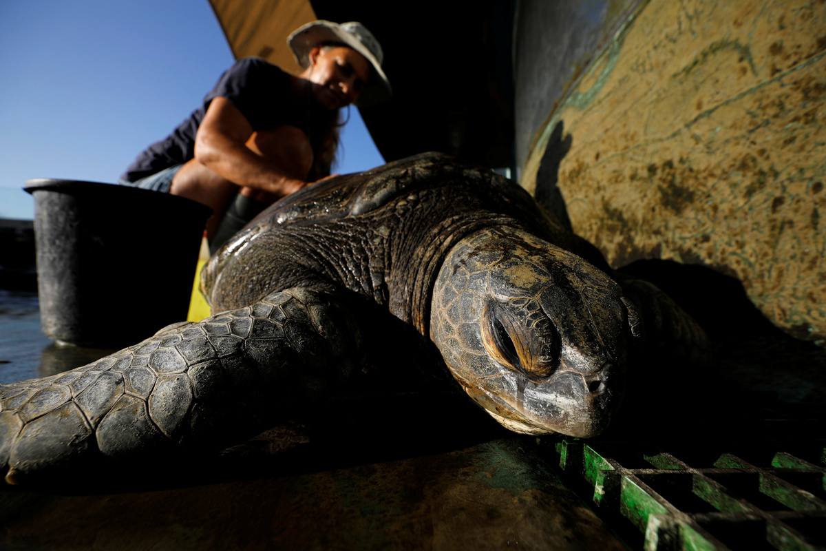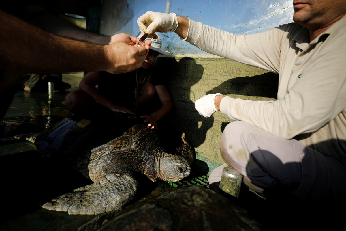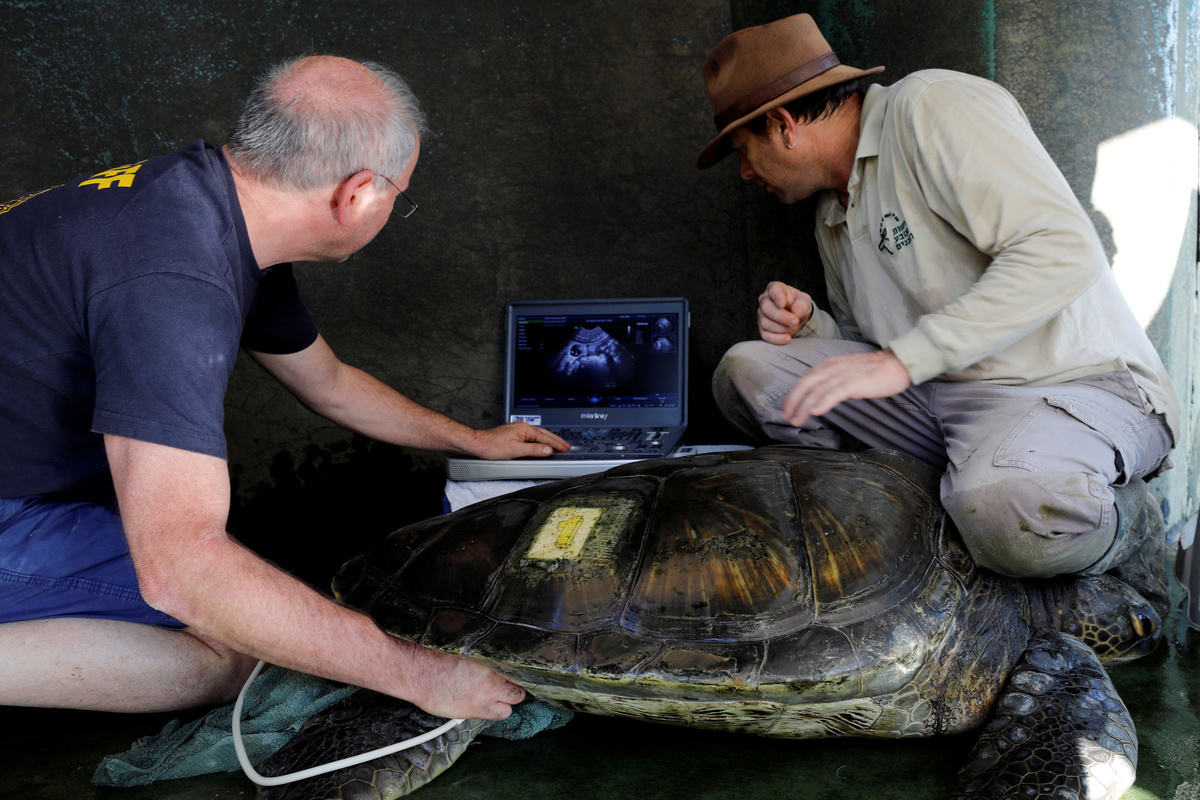 Newly-hatched baby sea turtles make their way into the Mediterranean Sea for the first time, as part of the Israeli Sea Turtle Rescue Center's conservation programme, at a beach near Mikhmoret north of Tel Aviv, Israel September 9, 2019.REUTERS/Amir CohenA veterinarian performs an ultrasound scan on a female green sea turtle as part of a conservation programme at the Israeli Sea Turtle Rescue Center, in Mikhmoret north of Tel Aviv, Israel September 23, 2019. REUTERS/Amir CohenA green sea turtle is seen at the Israeli Sea Turtle Rescue Center, in Mikhmoret north of Tel Aviv, Israel September 23, 2019. REUTERS/Amir CohenA green sea turtle is seen next to a researcher at the Israeli Sea Turtle Rescue Center, in Mikhmoret north of Tel Aviv, Israel September 23, 2019. REUTERS/Amir CohenResearchers perform blood tests on a green sea turtle as part of a conservation programme at the Israeli Sea Turtle Rescue Center, in Mikhmoret north of Tel Aviv, Israel September 23, 2019. REUTERS/Amir CohenChildren hold newly-hatched baby sea turtles born at a protective nesting site set-up as part of the Israeli Sea Turtle Rescue Center's conservation programme, at a beach near Mikhmoret north of Tel Aviv, Israel September 9, 2019. REUTERS/Amir CohenTwo green sea turtles touch heads at the Israeli Sea Turtle Rescue Center, in Mikhmoret north of Tel Aviv, Israel September 23, 2019. REUTERS/Amir CohenA volunteer looks at a sea turtle nest inside a fenced-off protective nesting site, set-up as part the Israeli Sea Turtle Rescue Center's conservation programme, at a Mediterranean beach near Mikhmoret, north of Tel Aviv, Israel September 9, 2019. REUTERS/Amir CohenA sea turtle hatchling emerges from the sand as it comes out of its nest inside a fenced-off protective nesting site, set-up as part the Israeli Sea Turtle Rescue Center's conservation programme, at a Mediterranean beach near Mikhmoret, north of Tel Aviv, Israel September 9, 2019. REUTERS/Amir CohenA child holds a newly-hatched baby sea turtle born at a protective nesting site set-up as part of the Israeli Sea Turtle Rescue Center's conservation programme, at a beach near Mikhmoret north of Tel Aviv, Israel September 9, 2019. REUTERS/Amir CohenYaniv Levi, manager of the Israeli Sea Turtle Rescue Center, looks at egg shells from newly-hatched baby sea turtles in a fenced-off protective nesting site, set-up as part the center's conservation programme, at a Mediterranean beach near Mikhmoret, north of Tel Aviv, Israel September 9, 2019.REUTERS/Amir CohenA green sea turtle is surrounded by lettuce as it swims in a pool at the Israeli Sea Turtle Rescue Center, in Mikhmoret north of Tel Aviv, Israel September 23, 2019. REUTERS/Amir CohenA newly-hatched baby sea turtle makes its way into the Mediterranean Sea for the first time, as part of the Israeli Sea Turtle Rescue Center's conservation programme, at a beach near Mikhmoret north of Tel Aviv, Israel September 9, 2019. REUTERS/Amir CohenA researcher draws blood from a green sea turtle as part of a conservation programme at the Israeli Sea Turtle Rescue Center, in Mikhmoret north of Tel Aviv, Israel September 23, 2019. REUTERS/Amir CohenA general view shows a fenced-off protective nesting site for sea turtles, set-up as part the Israeli Sea Turtle Rescue Center's conservation programme, at a Mediterranean beach near Mikhmoret, north of Tel Aviv, Israel September 9, 2019. REUTERS/Amir Cohen