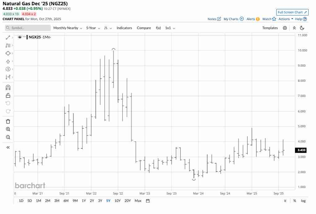 The monthly chart highlights the mostly sideways trend that caused the NYMEX natural gas futures to settle at $3.303 per MMBtu on September 30, 2025. The natural gas futures are steady in Q4, trading around the $3.43 per MMBtu level on October 27, with the December futures just above $4 as the peak demand and inventory withdrawal season approaches.