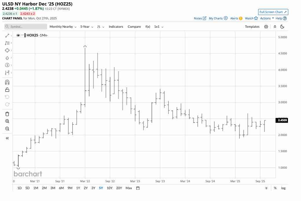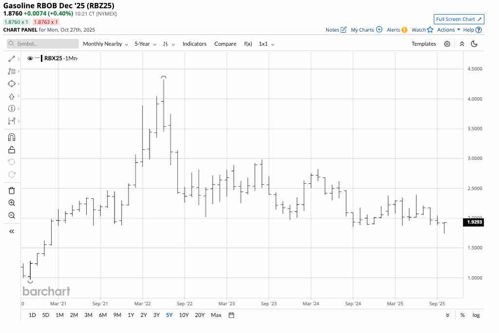 The monthly chart highlights the bearish trend that sent the gasoline futures to settle at $1.9729 per gallon wholesale on September 30, 2025. The gasoline futures have continued to reach lower lows in Q4, falling to $1.7407 per barrel on October 17, the lowest price since February 2021, before recovering.