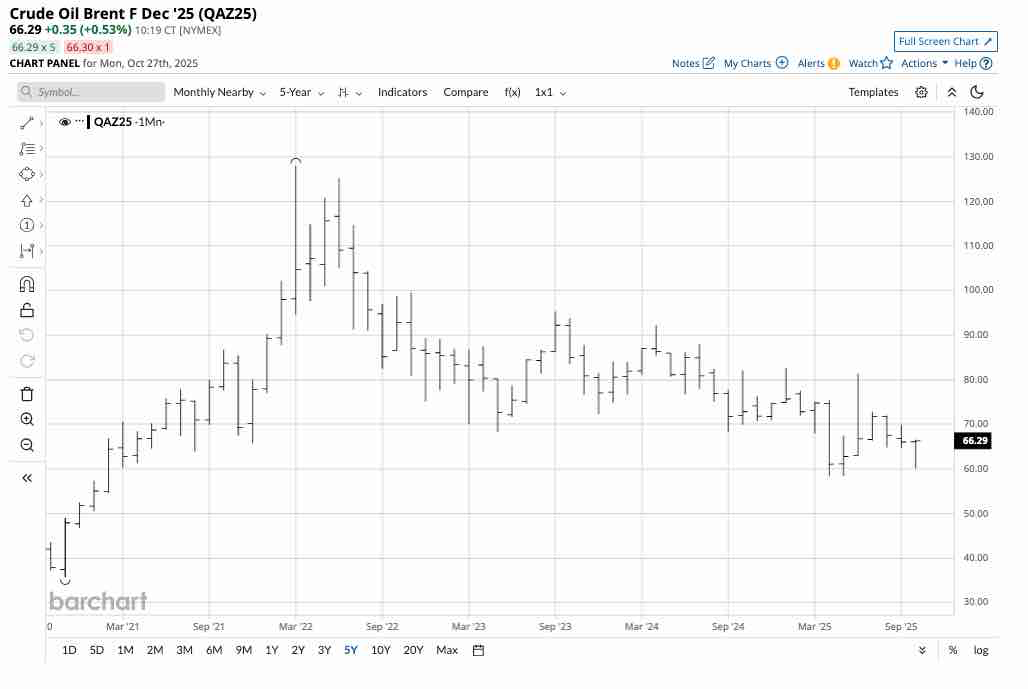 The monthly chart highlights the bearish trend that sent the Brent futures to settle at $67.16 per barrel on September 30, 2025. The Brent futures have continued to reach lower lows in Q4, falling to $60.07 per barrel on October 20, just above the April 2025 low of $58.39, the critical technical support level. The Brent futures recovered and were above $66 per barrel on October 2. 7