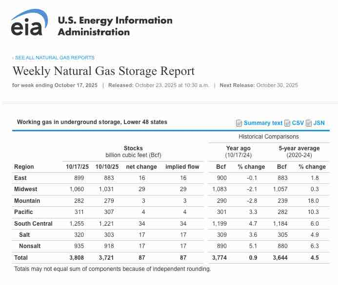 As the chart highlights, as of the week ending on October 17, 2025, natural gas inventories across the United States at 3.808 trillion cubic feet were 0.9% above last year’s level, and 4.5% over the five-year average for mid-October. As the season where withdrawal from stockpiles approaches, natural gas stocks peaked at 3.972 trillion cubic feet at the end of the 2024 injection season. Time will tell if stocks reach that level over the coming weeks before they begin declining.