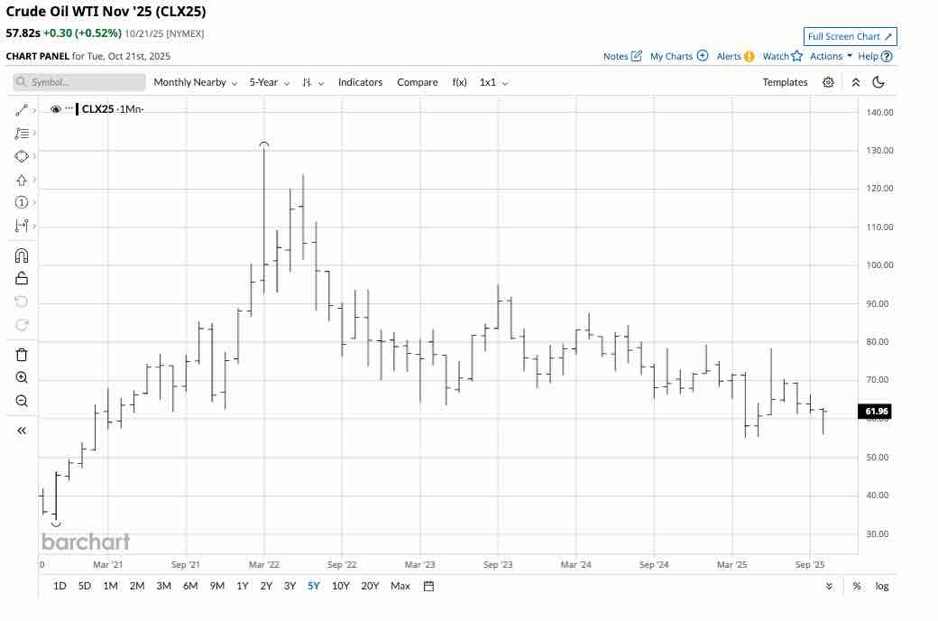 The monthly chart highlights the bearish trend that sent the WTI futures to settle at $62.37 per barrel on September 30, 2025. The NYMEX futures have continued to reach lower lows in Q4, falling to $55.96 per barrel on October 20, just above the April 2025 low of $55.12, the critical technical support level. After recovering, crude oil futures were just below the $62 per barrel level on October 27.