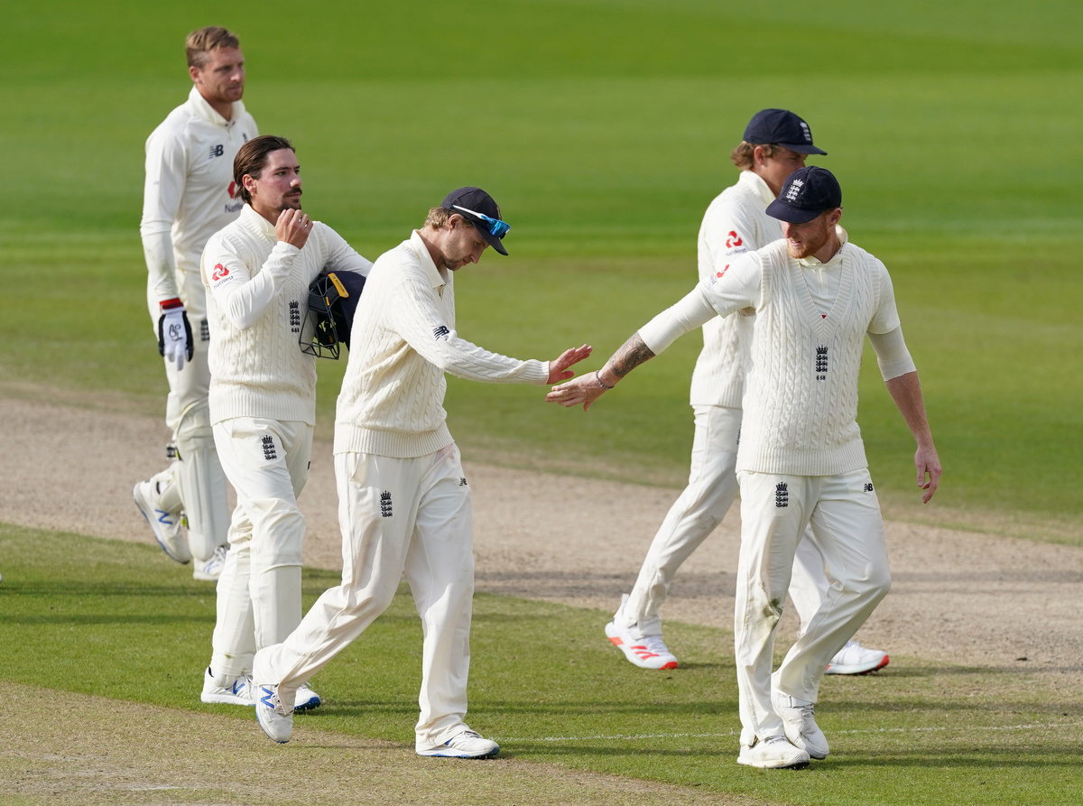Cricket - Second Test - England v West Indies - Emirates Old Trafford, Manchester, Britain - July 20, 2020 England's Joe Root celebrates with Ben Stokes after winning the test, as play resumes behind closed doors following the outbreak of the coronavirus disease (COVID-19) Jon Super/Pool via REUTERSCricket - Second Test - England v West Indies - Emirates Old Trafford, Manchester, Britain - July 20, 2020 England's Jos Buttler celebrates with teammates after winning the test, as play resumes behind closed doors following the outbreak of the coronavirus disease (COVID-19) Jon Super/Pool via REUTERS
