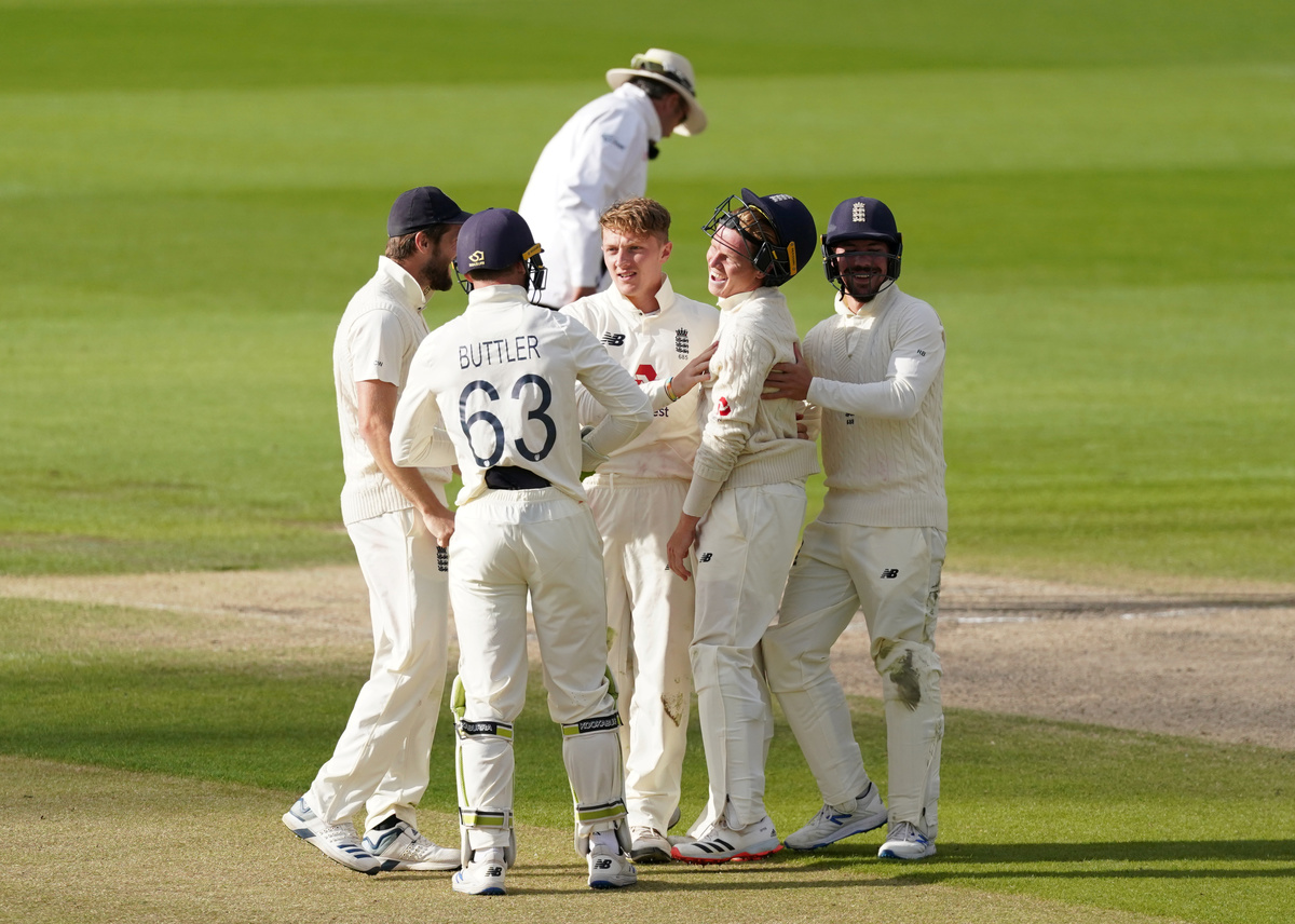 Cricket - Second Test - England v West Indies - Emirates Old Trafford, Manchester, Britain - July 20, 2020 England's Ollie Pope celebrates after catching out West Indies' Kemar Roach to win the test with teammates, as play resumes behind closed doors following the outbreak of the coronavirus disease (COVID-19) Michael Steele/Pool via REUTERS