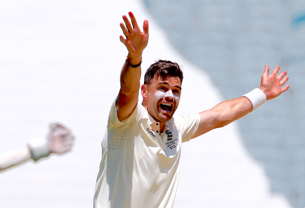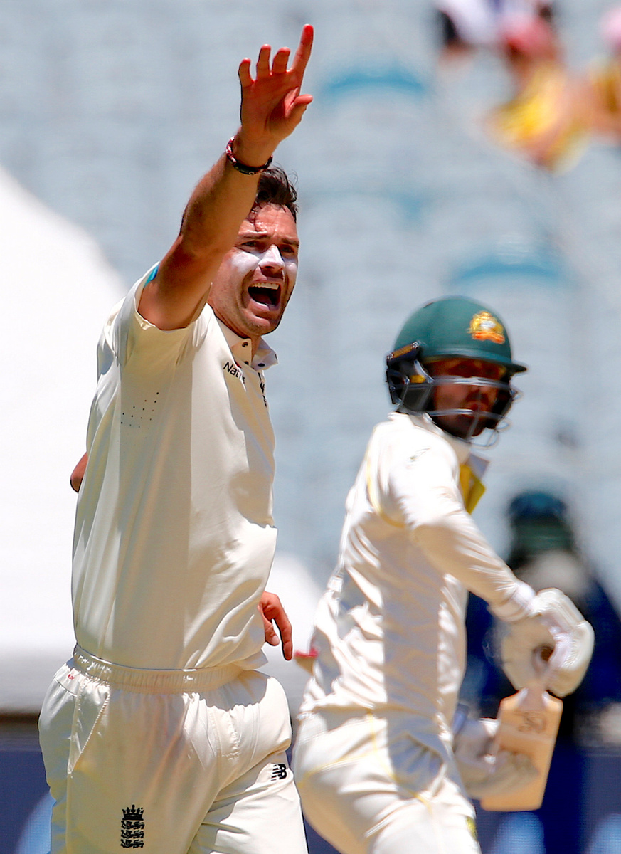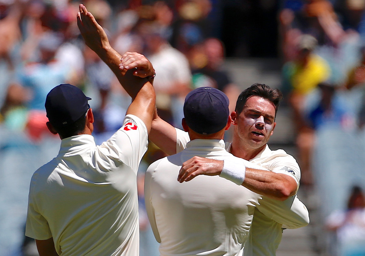 Cricket - Ashes test match - Australia v England - MCG, Melbourne, Australia, December 27, 2017. England's Stuart Broad celebrates with team mate James Anderson after dismissing Australia's Nathan Lyon during the second day of the fourth Ashes cricket test match. REUTERS/David GrayCricket - Ashes test match - Australia v England - MCG, Melbourne, Australia, December 27, 2017. England's James Anderson celebrates dismissing Australia's Nathan Lyon during the second day of the fourth Ashes cricket test match. REUTERS/David GrayCricket - Ashes test match - Australia v England - MCG, Melbourne, Australia, December 26, 2017. England's James Anderson celebrates with team mates after dismissing Australia's David Warner during the first day of the fourth Ashes cricket test match. REUTERS/David GrayCricket - Ashes test match - Australia v England - MCG, Melbourne, Australia, December 27, 2017. England's James Anderson reacts after bowling a delivery during the second day of the fourth Ashes cricket test match. REUTERS/David GrayCricket - Ashes test match - Australia v England - MCG, Melbourne, Australia, December 27, 2017. England's James Anderson celebrates dismissing Australia's Nathan Lyon during the second day of the fourth Ashes cricket test match. REUTERS/David Gray