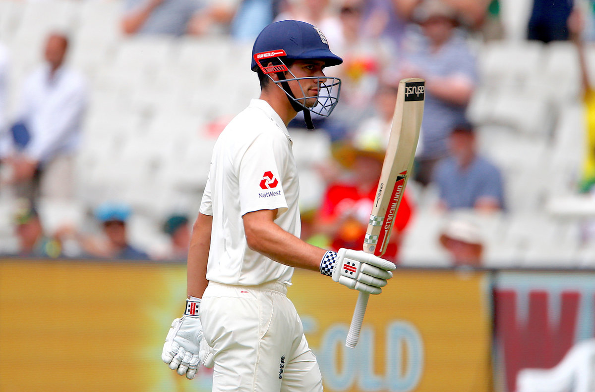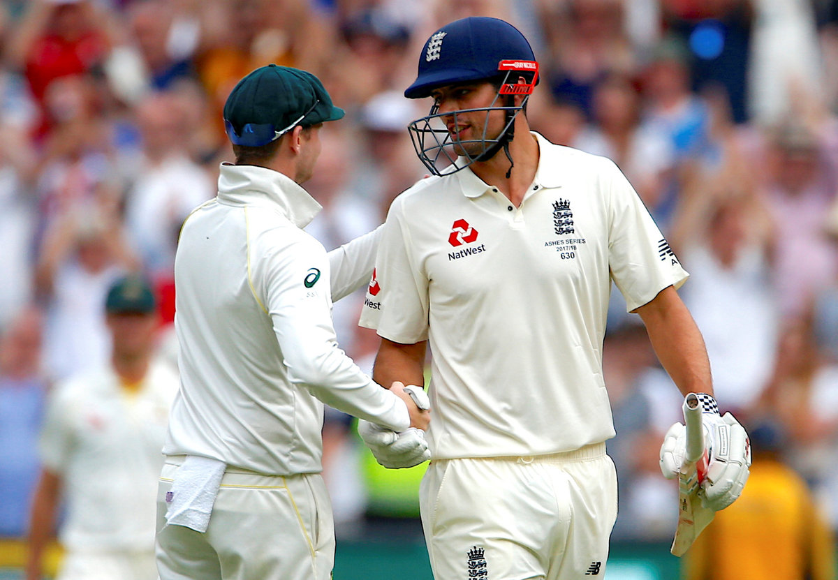 Cricket - Ashes test match - Australia v England - MCG, Melbourne, Australia, December 28, 2017. England's Alastair Cook reacts as he walks off the ground at the end of the third day of the fourth Ashes cricket test match. REUTERS/David GrayCricket - Ashes test match - Australia v England - MCG, Melbourne, Australia, December 28, 2017. England's Alastair Cook shakes hands with Australia's captain Steve Smith as he walks off the ground at the end of the third day of the fourth Ashes cricket test match. REUTERS/David GrayCricket - Ashes test match - Australia v England - MCG, Melbourne, Australia, December 28, 2017. England's Alastair Cook shakes hands with Australia's Josh Hazlewood as he walks off the ground at the end of the third day of the fourth Ashes cricket test match. REUTERS/David GrayCricket - Ashes test match - Australia v England - MCG, Melbourne, Australia, December 29, 2017. Australian players congratulate England's Alastair Cook as he walks off the ground at the end of England's first innings during the fourth day of the fourth Ashes cricket test match. REUTERS/David GrayCricket - Ashes test match - Australia v England - MCG, Melbourne, Australia, December 29, 2017. England's Alastair Cook reacts as he walks off the ground at the end of England's first innings during the fourth day of the fourth Ashes cricket test match. REUTERS/David Gray