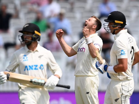 BJ Watling was then squared up to send a catch fizzing into the hands of Dom Sibley at second slip, before Robinson trapped Colin de Grandhomme in front, with a review eventually confirming an LBW decision and a 10-ball duck. Mitchell Santner tamely bumped Wood to James Anderson at cover, and the latter picked up his second wicket of the innings when Southee was caught behind for James Bracey’s maiden catch as a Test wicketkeeper shortly after Broad’s fumble.