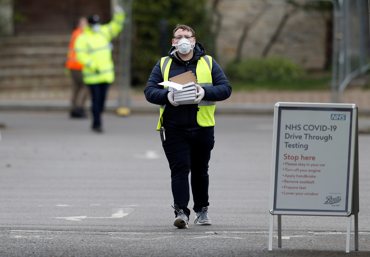 Medical staff at an NHS drive through coronavirus disease (COVID-19) testing facility in the car park of Chessington World of Adventures, as the spread of the coronavirus disease (COVID-19) continues, Chessington, Britain, March 30, 2020. REUTERS/Peter Nicholls