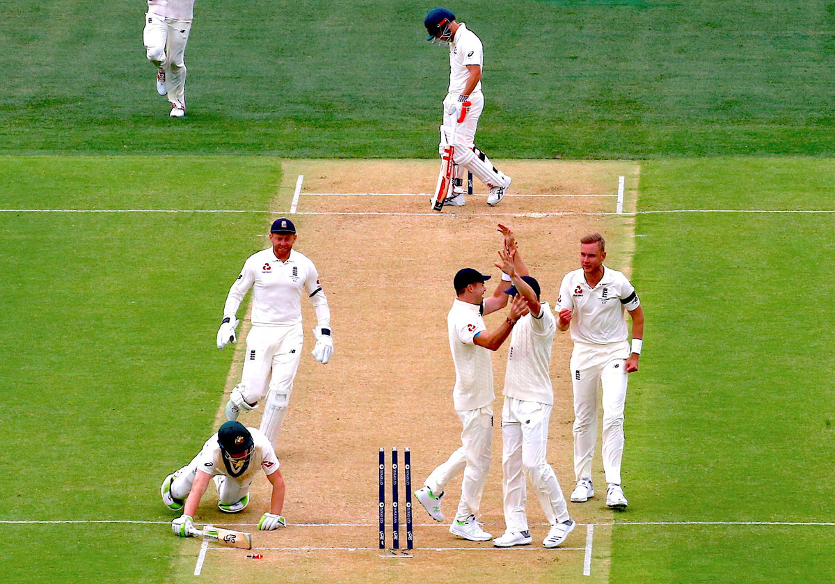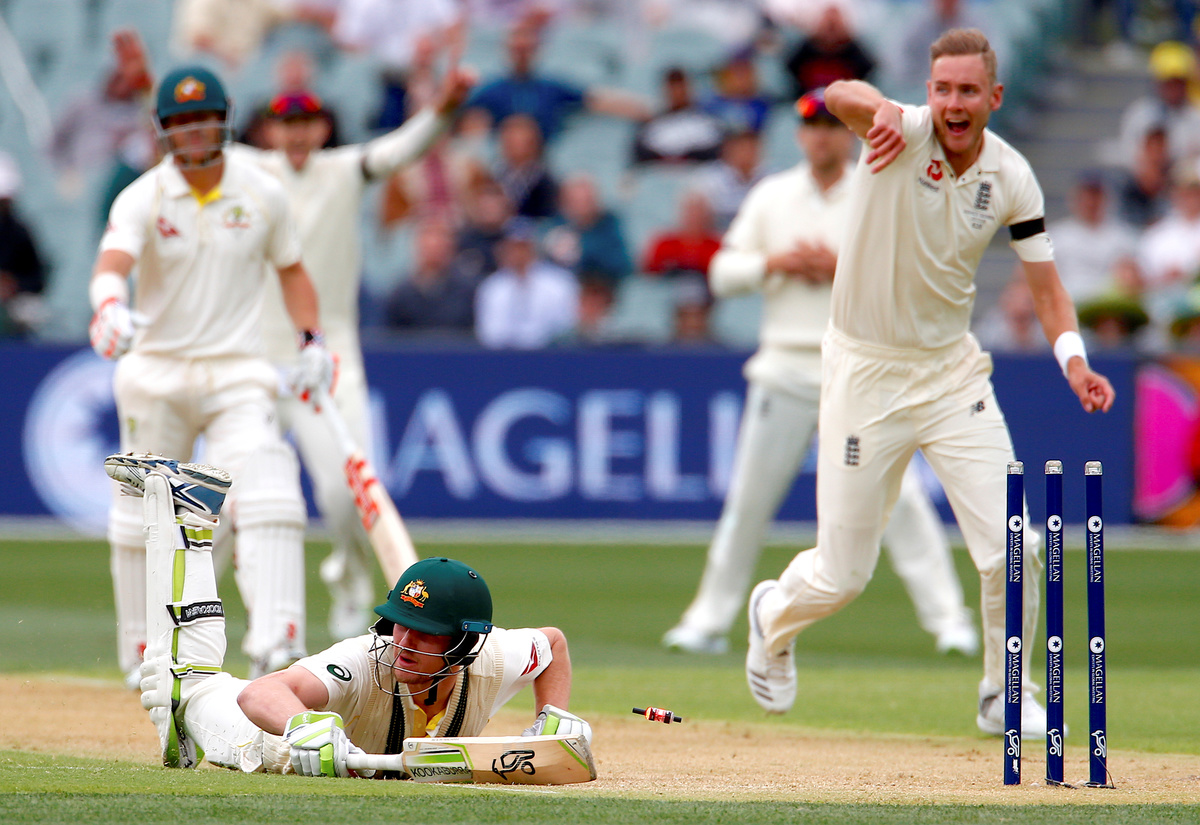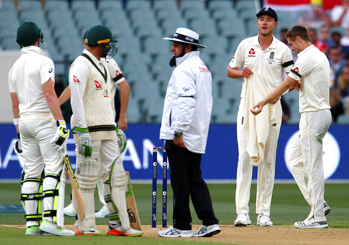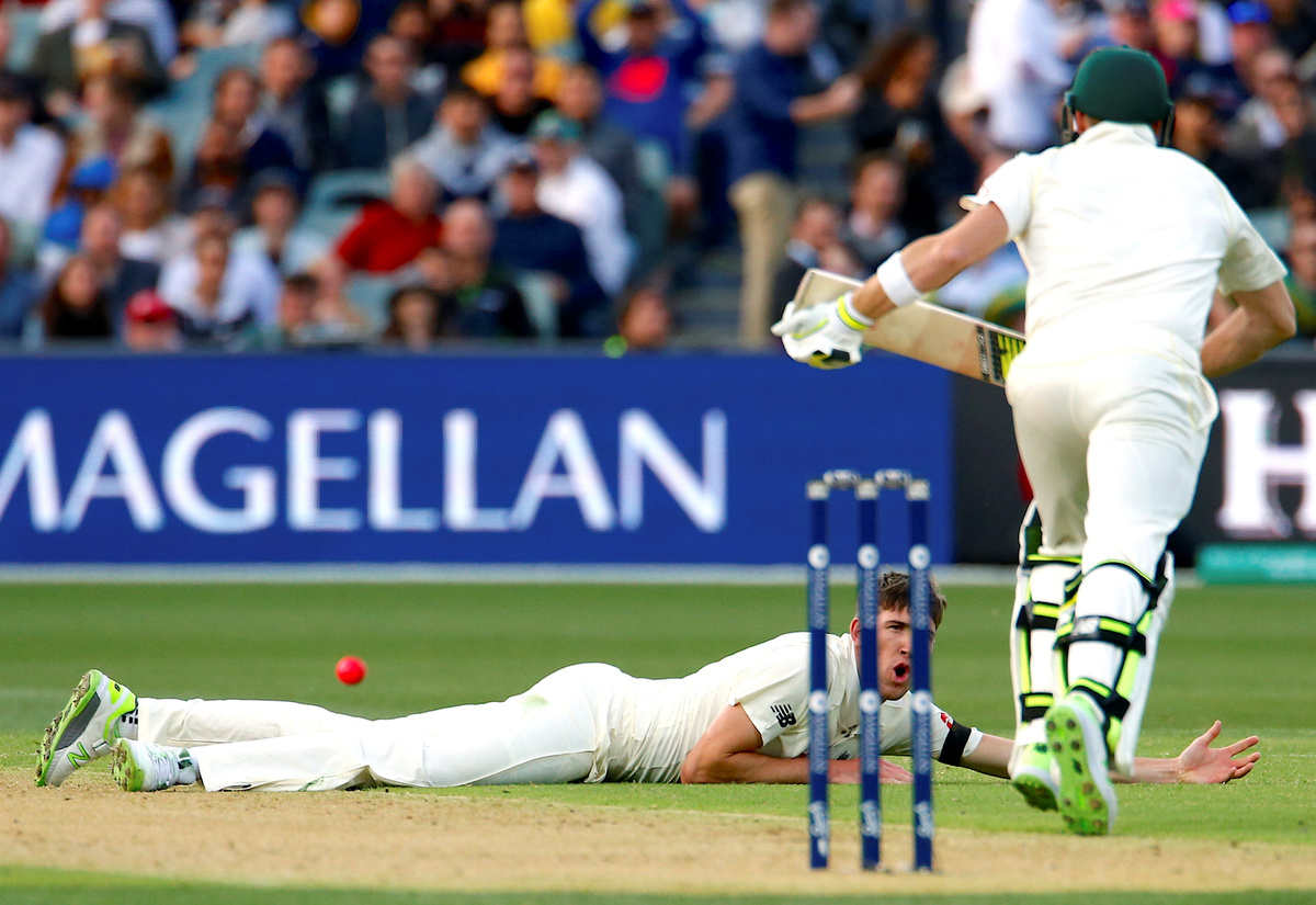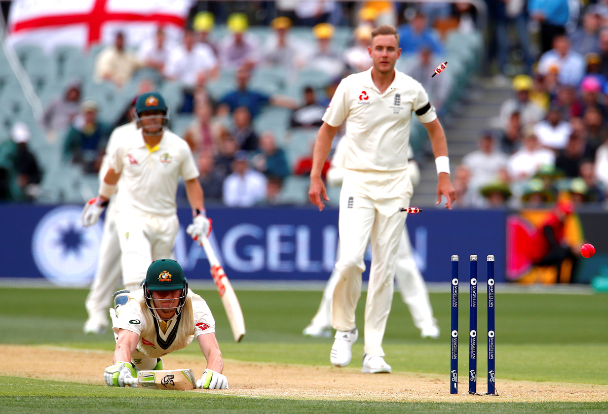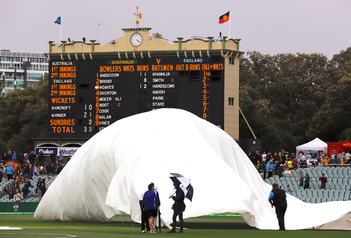Cricket - Ashes test match - Australia v England - Adelaide Oval, Adelaide, Australia - December 2, 2017 England's Craig Overton reacts after diving to try and reach a catch from Australia's captain Steve Smith during the first day of the second Ashes cricket test match. REUTERS/David GrayCricket - Ashes test match - Australia v England - Adelaide Oval, Adelaide, Australia - December 2, 2017 England's Mark Stoneman drops a catch from Australia's Usman Khawaja during the first day of the second Ashes cricket test match. REUTERS/David GrayCricket - Ashes test match - Australia v England - Adelaide Oval, Adelaide, Australia - December 2, 2017 England's Stuart Broad watches with Australia's David Warner as Cameron Bancroft is run out during the first day of the second Ashes cricket test match. REUTERS/David GrayCricket - Ashes test match - Australia v England - Adelaide Oval, Adelaide, Australia - December 2, 2017 England's Stuart Broad reacts after Australia's Cameron Bancroft is run out during the first day of the second Ashes cricket test match. REUTERS/David GrayCricket - Ashes test match - Australia v England - Adelaide Oval, Adelaide, Australia - December 2, 2017 England's Stuart Broad watches with Australia's David Warner as Cameron Bancroft is run out during the first day of the second Ashes cricket test match. REUTERS/David GrayCricket - Ashes test match - Australia v England - Adelaide Oval, Adelaide, Australia - December 2, 2017 England's Stuart Broad reacts with team mates after Australia's Cameron Bancroft is run out during the first day of the second Ashes cricket test match. REUTERS/David GrayCricket - Ashes test match - Australia v England - Adelaide Oval, Adelaide, Australia - December 2, 2017 Australia's David Warner tries to hit a shot during the first day of the second Ashes cricket test match. REUTERS/David GrayCricket - Ashes test match - Australia v England - Adelaide Oval, Adelaide, Australia - December 2, 2017 England's Craig Overton bowls during the first day of the second Ashes cricket test match. REUTERS/David GrayCricket - Ashes test match - Australia v England - Adelaide Oval, Adelaide, Australia - December 2, 2017 The crowd reacts as England's Dawid Malan fails to stop a boundary during the first day of the second Ashes cricket test match. REUTERS/David GrayCricket - Ashes test match - Australia v England - Adelaide Oval, Adelaide, Australia, December 2, 2017. Ground staff pull covers off the pitch during the first day of the second Ashes cricket test match. REUTERS/David GrayCricket - Ashes test match - Australia v England - Adelaide Oval, Adelaide, Australia, December 2, 2017. Ground staff pull covers over the pitch as rain falls during the first day of the second Ashes cricket test match. REUTERS/David GrayCricket - Ashes test match - Australia v England - Adelaide Oval, Adelaide, Australia, December 2, 2017. The ground lights are turned on as rain clouds move in during the first day of the second Ashes cricket test match. REUTERS/David GrayCricket - Ashes test match - Australia v England - Adelaide Oval, Adelaide, Australia, December 2, 2017. England's James Anderson reacts during the first day of the second Ashes cricket test match. REUTERS/David GrayCricket - Ashes test match - Australia v England - Adelaide Oval, Adelaide, Australia, December 2, 2017. Australia's Cameron Bancroft is hit by a delivery from England's James Anderson during the first day of the second Ashes cricket test match. REUTERS/David GrayCricket - Ashes test match - Australia v England - Adelaide Oval, Adelaide, Australia, December 2, 2017. England's Stuart Broad shakes hands with a spectator after returning his hat during the first day of the second Ashes cricket test match. REUTERS/David GrayCricket - Ashes test match - Australia v England - Adelaide Oval, Adelaide, Australia, December 2, 2017. Australia's David Warner rund off the ground as rain falls during the first day of the second Ashes cricket test match. REUTERS/David GrayCricket - Ashes test match - Australia v England - Adelaide Oval, Adelaide, Australia, December 2, 2017. England captain Joe Root walks off the field with team mates as rain falls during the first day of the second Ashes cricket test match. REUTERS/David Gray