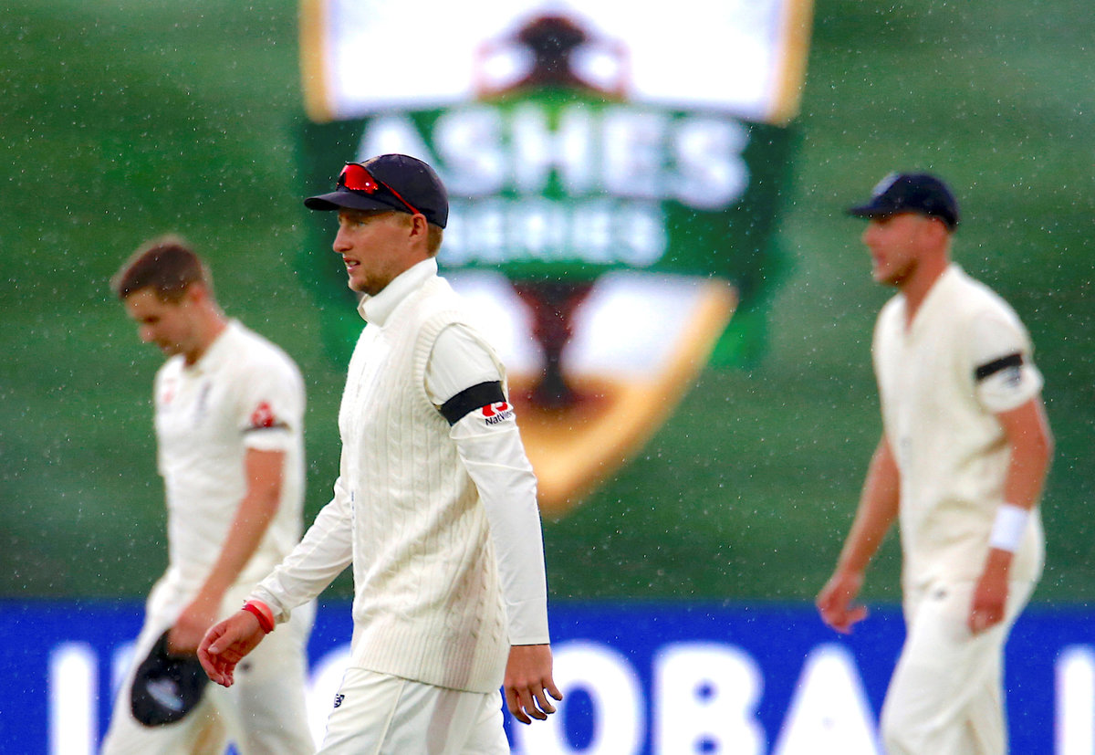 Cricket - Ashes test match - Australia v England - Adelaide Oval, Adelaide, Australia - December 2, 2017 England captain Joe Root walks off the field with team mates as rain falls during the first day of the second Ashes cricket test match. REUTERS/David Gray