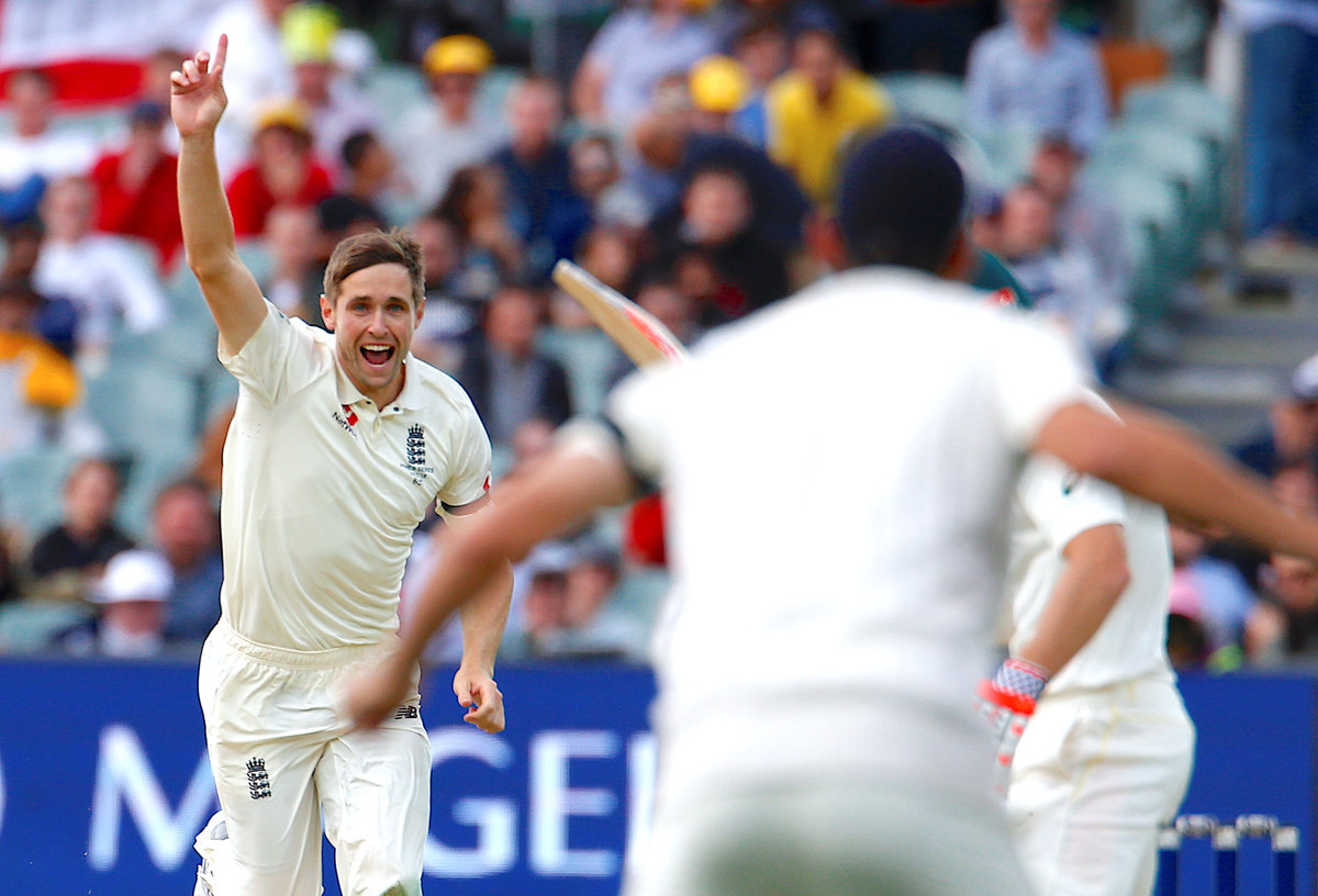 Cricket - Ashes test match - Australia v England - Adelaide Oval, Adelaide, Australia - December 2, 2017 England's Chris Woakes reacts after taking the wicket of Australia's David Warner during the first day of the second Ashes cricket test match. REUTERS/David Gray