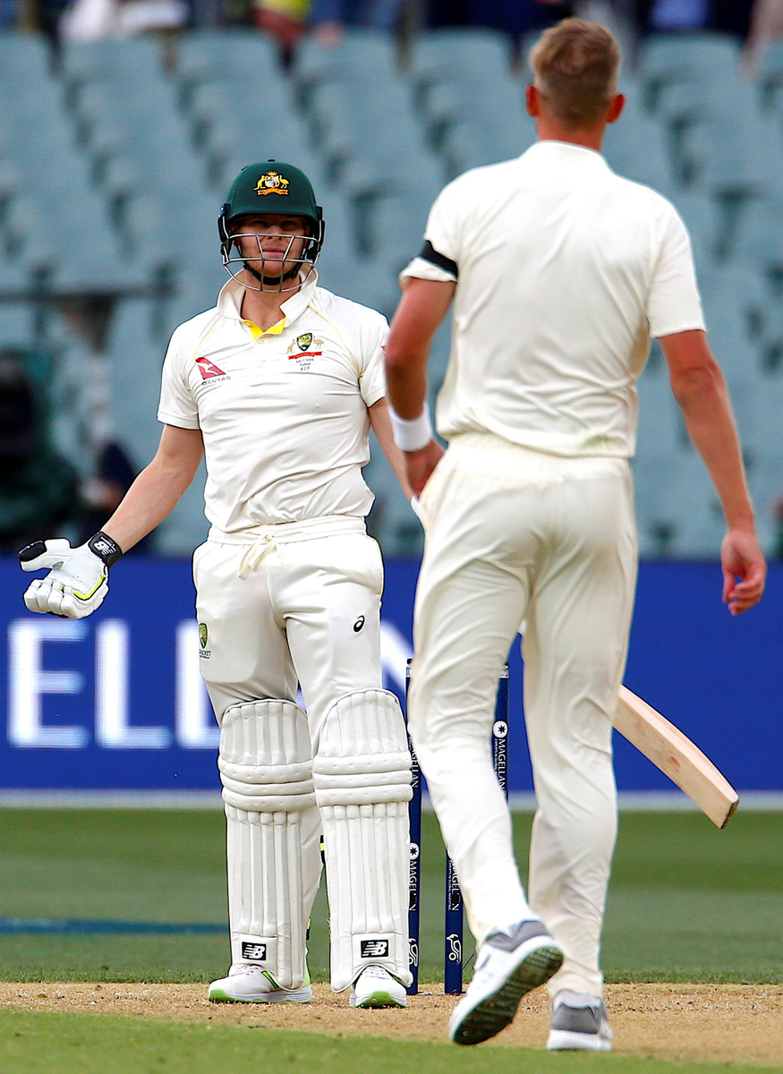 Cricket - Ashes test match - Australia v England - Adelaide Oval, Adelaide, Australia - December 2, 2017 Australia's captain Steve Smith reacts as England's Stuart Broad talks to him during the first day of the second Ashes cricket test match. REUTERS/David Gray