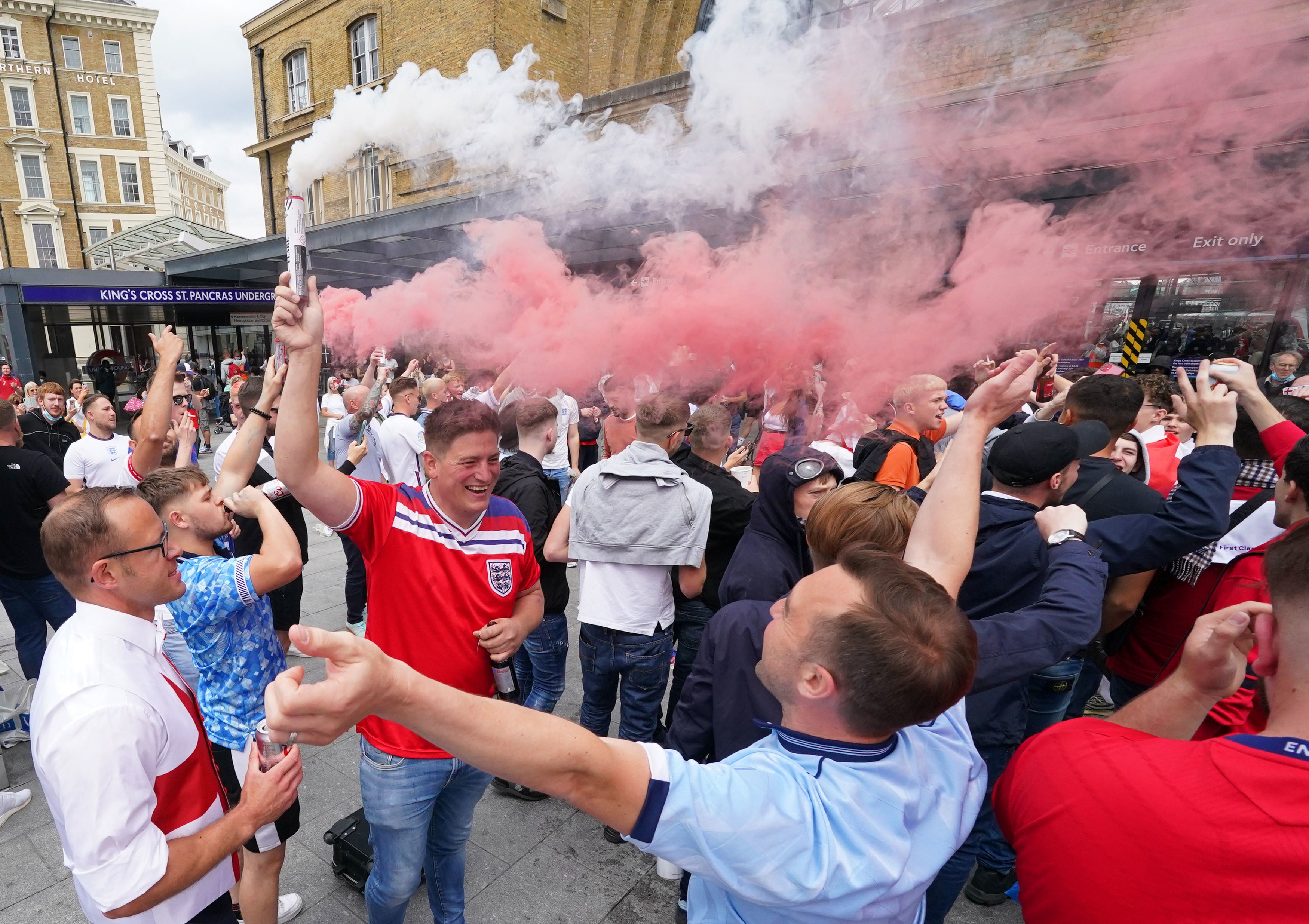 Some boisterous supporters even climbed on top of a bus outside the grounds, while others outside King’s Cross station in the capital let off red and white smoke during the celebratory build-up.