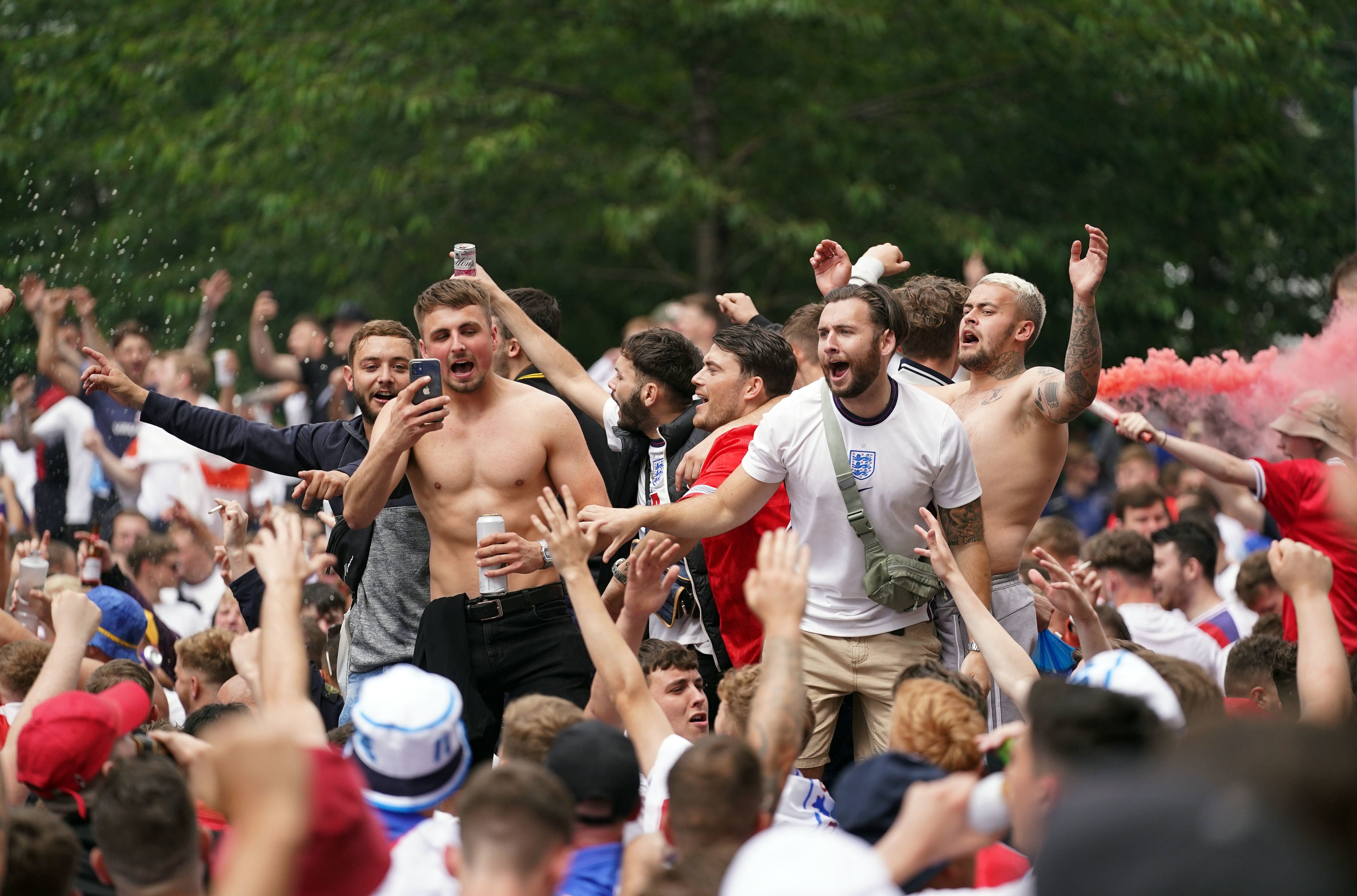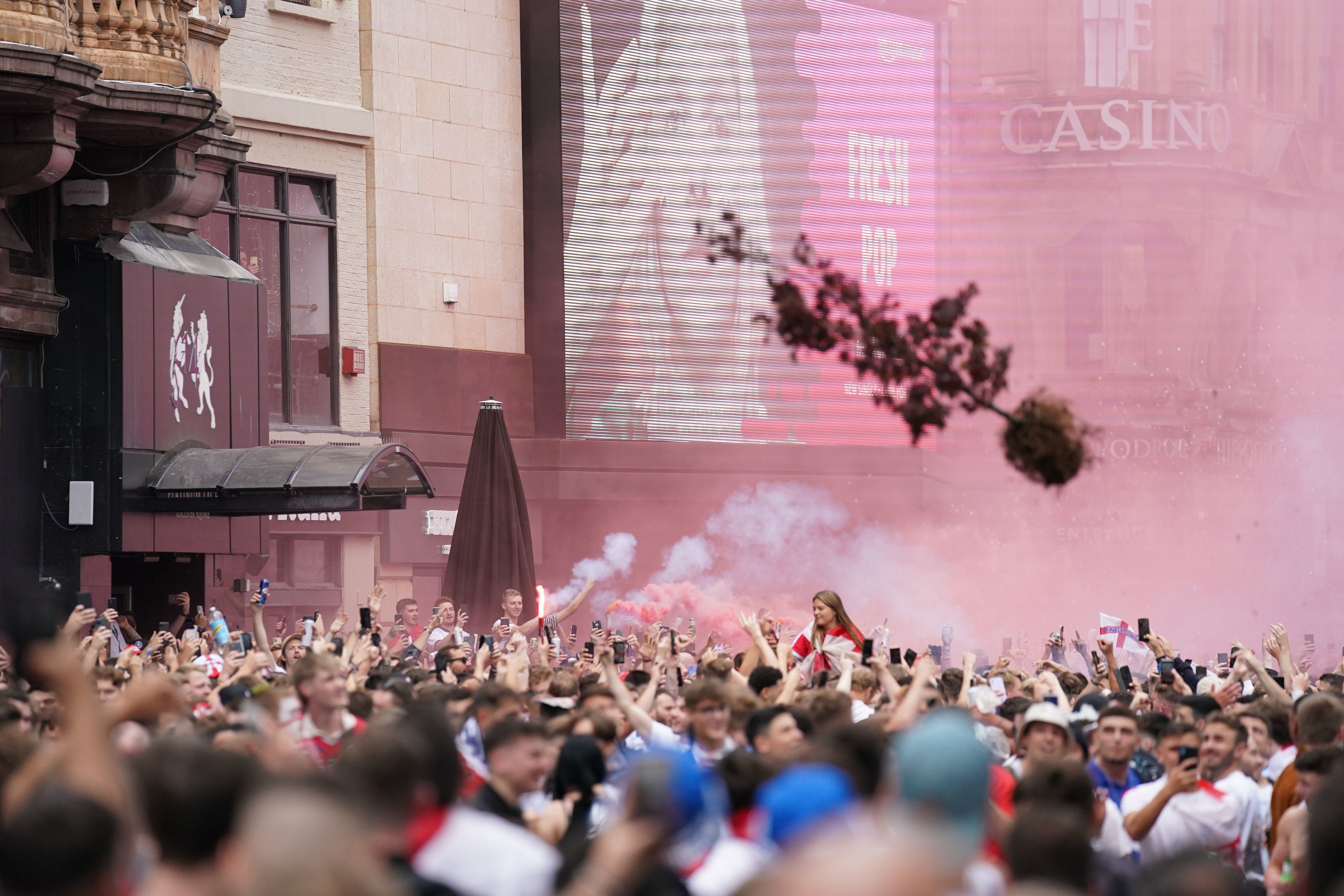 England fans throw a decorative tree in Leicester Square, central London, ahead of Sunday’s Euro 2020 final at Wembley