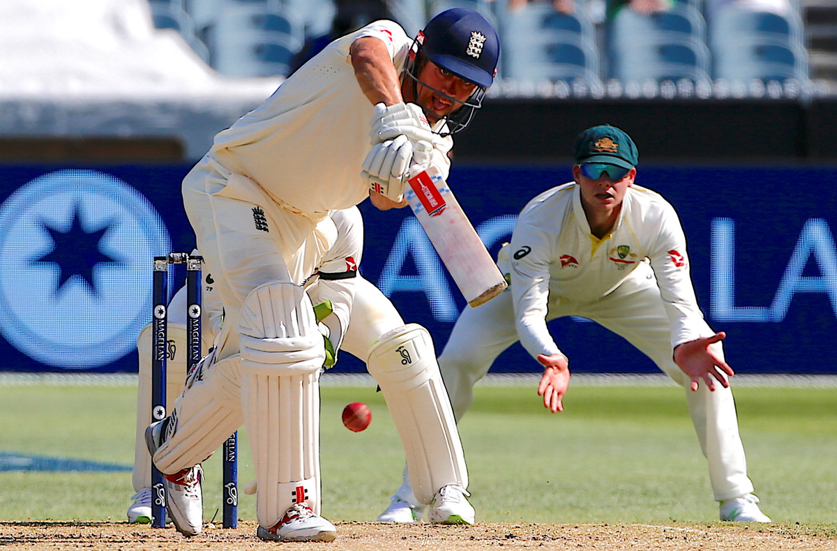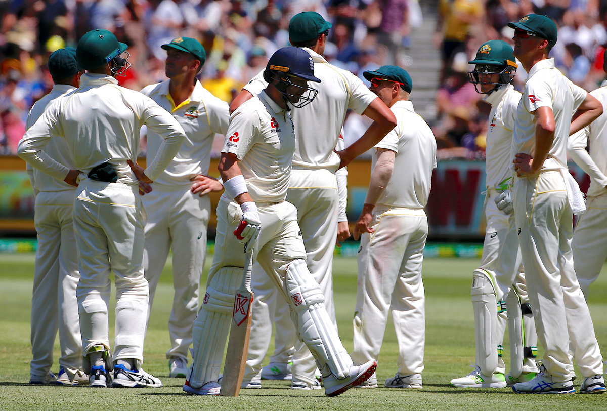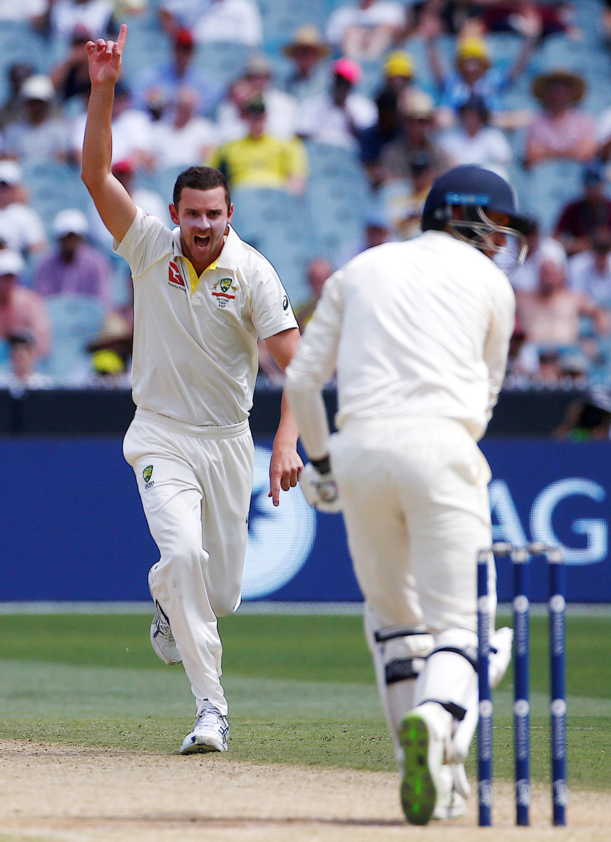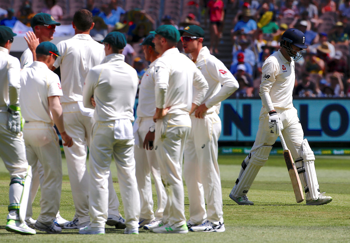 Cricket - Ashes test match - Australia v England - MCG, Melbourne, Australia, December 27, 2017. Australia's Josh Hazlewood celebrates with team mates as England's James Vince walks off the ground after being dismissed during the second day of the fourth Ashes cricket test match. REUTERS/David GrayCricket - Ashes test match - Australia v England - MCG, Melbourne, Australia, December 27, 2017. England's Mark Stoneman backs away from a delivery from Australia's Josh Hazlewood due to a butterfly during the second day of the fourth Ashes cricket test match. REUTERS/David GrayCricket - Ashes test match - Australia v England - MCG, Melbourne, Australia, December 27, 2017. England's Stuart Broad celebrates with team mate James Anderson after dismissing Australia's Nathan Lyon during the second day of the fourth Ashes cricket test match. REUTERS/David GrayCricket - Ashes test match - Australia v England - MCG, Melbourne, Australia, December 27, 2017. Australia's Josh Hazlewood celebrates dismissing England's James Vince during the second day of the fourth Ashes cricket test match. REUTERS/David GrayCricket - Ashes test match - Australia v England - MCG, Melbourne, Australia, December 27, 2017. Australia's captain Steve Smith drops a catch from England's Alastair Cook during the second day of the fourth Ashes cricket test match. REUTERS/David GrayCricket - Ashes test match - Australia v England - MCG, Melbourne, Australia, December 27, 2017. Australia's Nathan Lyon stops a boundary during the second day of the fourth Ashes cricket test match. REUTERS/David GrayCricket - Ashes test match - Australia v England - MCG, Melbourne, Australia, December 27, 2017. England's Mark Stoneman walks past Australian players as they celebrate his dismissal during the second day of the fourth Ashes cricket test match. REUTERS/David GrayCricket - Ashes test match - Australia v England - MCG, Melbourne, Australia, December 27, 2017. England's James Anderson celebrates dismissing Australia's Nathan Lyon during the second day of the fourth Ashes cricket test match. REUTERS/David GrayCricket - Ashes test match - Australia v England - MCG, Melbourne, Australia, December 27, 2017. England's Stuart Broad reacts with team mates after they appealed for LBW for Australia's Shaun Marsh, which was given on appeal, during the second day of the fourth Ashes cricket test match. REUTERS/David GrayCricket - Ashes test match - Australia v England - MCG, Melbourne, Australia, December 27, 2017. England's James Anderson celebrates dismissing Australia's Nathan Lyon during the second day of the fourth Ashes cricket test match. REUTERS/David GrayCricket - Ashes test match - Australia v England - MCG, Melbourne, Australia, December 27, 2017. England's Stuart Broad reacts as he watches with team mates an LBW ruling for Australia's Shaun Marsh, which was given on appeal, during the second day of the fourth Ashes cricket test match. REUTERS/David GrayCricket - Ashes test match - Australia v England - MCG, Melbourne, Australia, December 27, 2017. England's Stuart Broad celebrates dismissing Australia's Jackson Bird LBW during the second day of the fourth Ashes cricket test match. REUTERS/David GrayCricket - Ashes test match - Australia v England - MCG, Melbourne, Australia, December 27, 2017. Australia's captain Steve Smith reacts after being bowled by England's Tom Curran during the second day of the fourth Ashes cricket test match. REUTERS/David GrayCricket - Ashes test match - Australia v England - MCG, Melbourne, Australia, December 27, 2017. Australia's Jackson Bird reacts after a shot from England's James Vince during the second day of the fourth Ashes cricket test match. REUTERS/David GrayCricket - Ashes test match - Australia v England - MCG, Melbourne, Australia, December 27, 2017. England's James Anderson reacts after bowling a delivery during the second day of the fourth Ashes cricket test match. REUTERS/David GrayCricket - Ashes test match - Australia v England - MCG, Melbourne, Australia, December 27, 2017. England's captain Joe Root signals to the umpire as team mate Tom Curran celebrates after bowling Australia's captain Steve Smith during the second day of the fourth Ashes cricket test match. REUTERS/David GrayCricket - Ashes test match - Australia v England - MCG, Melbourne, Australia, December 27, 2017. Australia's Mitchell Marsh reacts after being bowled by England's Chris Woakes during the second day of the fourth Ashes cricket test match. REUTERS/David GrayCricket - Ashes test match - Australia v England - MCG, Melbourne, Australia, December 27, 2017. Australia's captain Steve Smith reacts as he walks off the ground after being bowled by England's Tom Curran during the second day of the fourth Ashes cricket test match. REUTERS/David GrayCricket - Ashes test match - Australia v England - MCG, Melbourne, Australia, December 27, 2017. England's Tom Curran looks towards the umpire as he celebrates with team mates after bowling Australia's captain Steve Smith during the second day of the fourth Ashes cricket test match. REUTERS/David GrayCricket - Ashes test match - Australia v England - MCG, Melbourne, Australia, December 26, 2017. Australia's captain Steve Smith plays a shot during the first day of the fourth Ashes cricket test match. REUTERS/David Gray