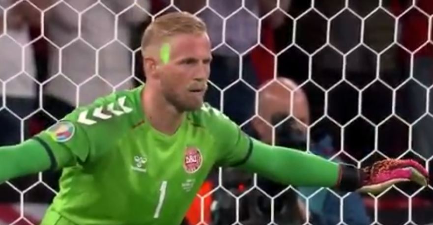 Television footage showed Schmeichel targeted by a spectator using a green laser as England captain Harry Kane stepped up for a penalty with the scores level at 1-1.