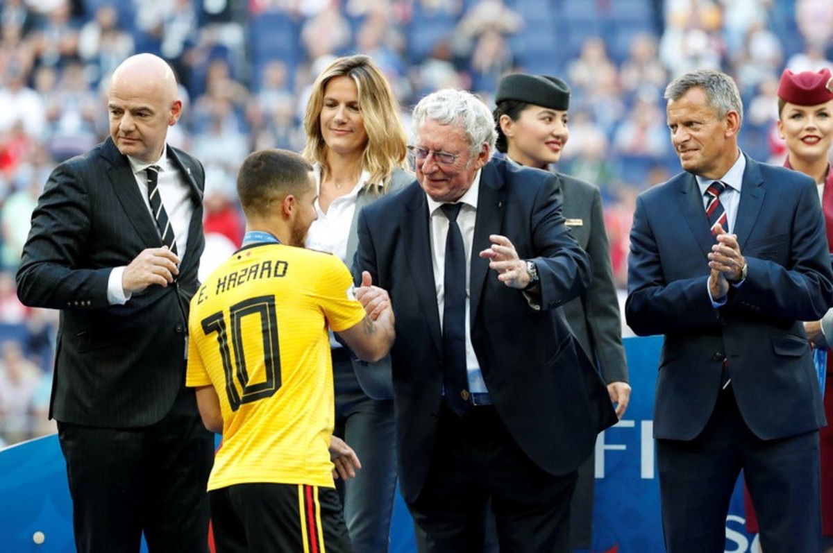 Soccer Football - World Cup - Third Place Play Off - Belgium v England - Saint Petersburg Stadium, Saint Petersburg, Russia - July 14, 2018 Belgium's Eden Hazard is presented a medal whie FIFA president Gianni Infantino looks on after the match REUTERS/Toru Hanai