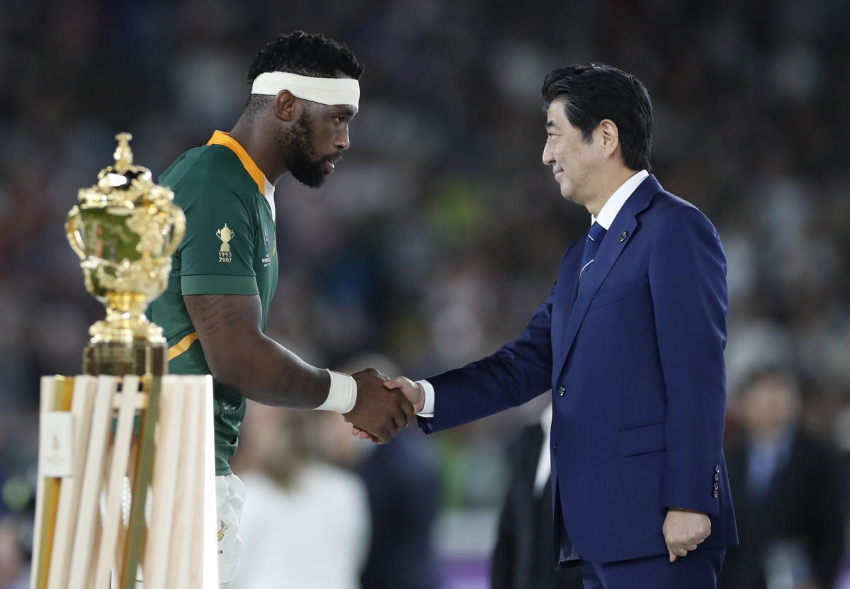 Rugby Union - Rugby World Cup - Final - England v South Africa - International Stadium Yokohama, Yokohama, Japan - November 2, 2019 South Africa's Siya Kolisi shake hands with Japanese Prime Minister Shinzo Abe on the podium next to the Webb Ellis Cup before the trophy presentation. REUTERS/Peter Cziborra