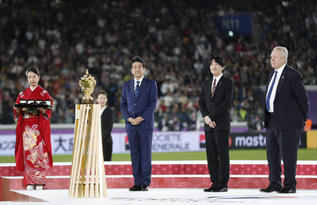 Rugby Union - Rugby World Cup - Final - England v South Africa - International Stadium Yokohama, Yokohama, Japan - November 2, 2019 Japanese Prime Minister Shinzo Abe, Japan's Crown Prince Akishino and World Rugby Chairman Bill Beaumont stand on the podium next to the Webb Ellis Cup before the trophy presentation. REUTERS/Peter Cziborra