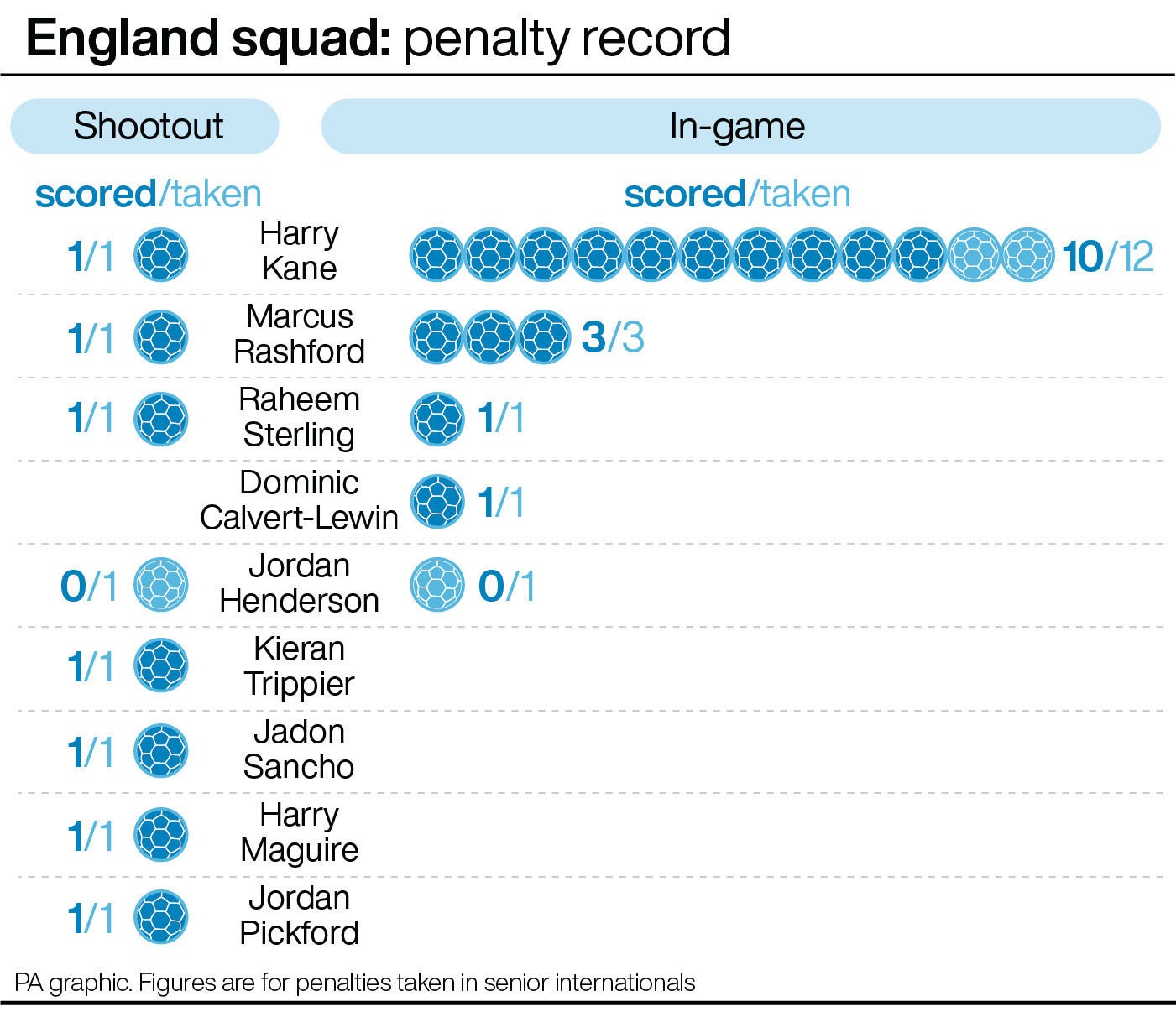 With Dier overlooked for the current tournament, along with Barkley, eight of England’s Euro 2020 squad have taken one penalty each in international shootouts.
