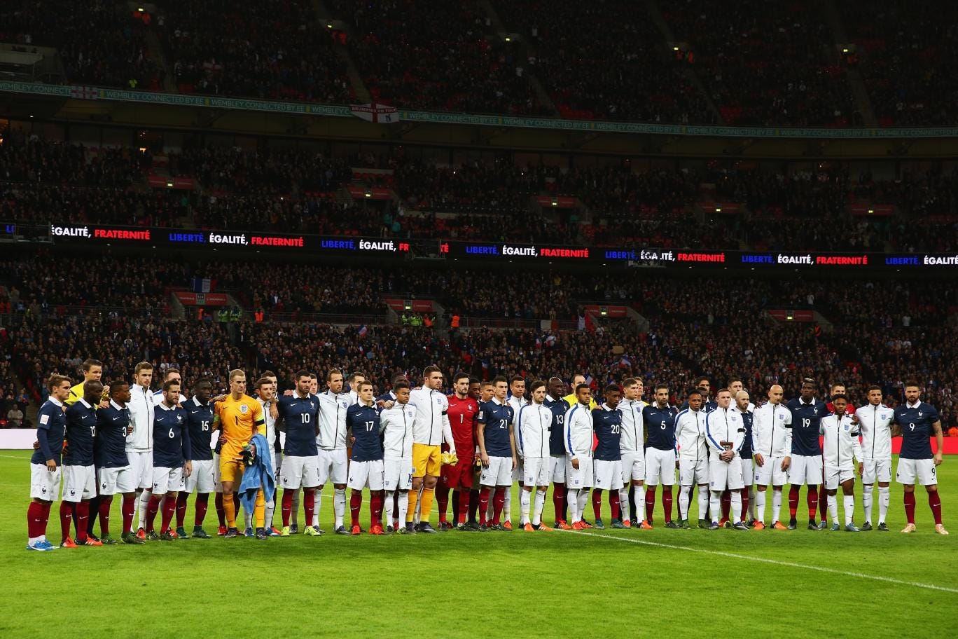 A report of the match in the magazine France Football read: “When La Marseillaise was sung, it was much more than an anthem that the French and English shared. It was the words: liberty, equality, brotherhood. It was the colours: red, white and blue. The grief, the pain, values. But also an emotional communion and a real sincerity. That of friendship, solidarity, unity. On Tuesday 17 November 2015, it was humanity that we shared.”