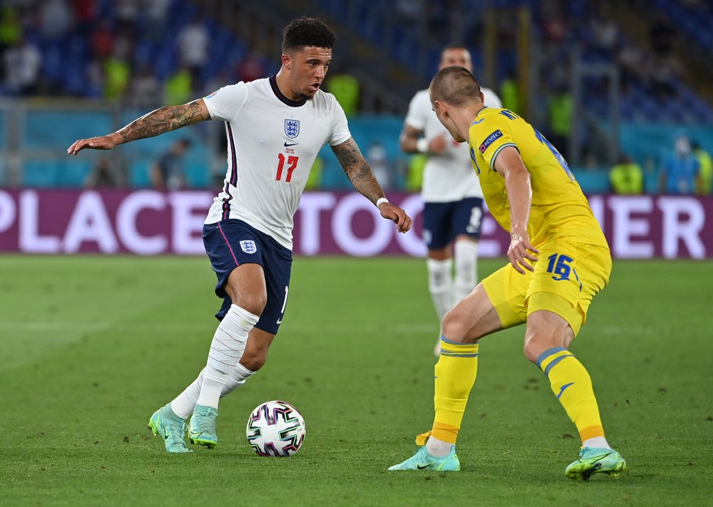 Jadon Sancho will make his first England start of Euro 2020 against Ukraine, with Gareth Southgate switching to a back four for the quarter-final in Rome.