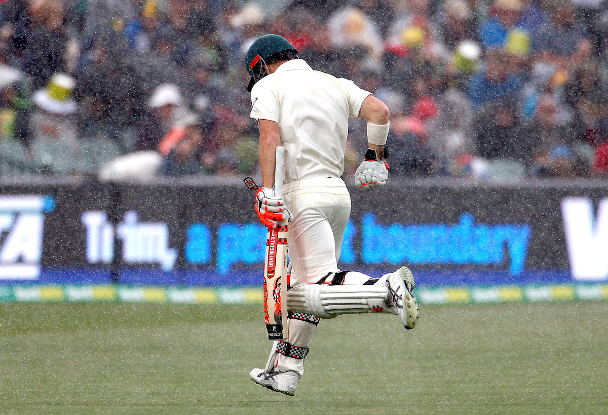 Cricket - Ashes test match - Australia v England - Adelaide Oval, Adelaide, Australia, December 2, 2017. England's James Anderson reacts during the first day of the second Ashes cricket test match. REUTERS/David GrayCricket - Ashes test match - Australia v England - Adelaide Oval, Adelaide, Australia, December 2, 2017. Australia's David Warner rund off the ground as rain falls during the first day of the second Ashes cricket test match. REUTERS/David GrayCricket - Ashes test match - Australia v England - Adelaide Oval, Adelaide, Australia, December 2, 2017. England captain Joe Root walks off the field with team mates as rain falls during the first day of the second Ashes cricket test match. REUTERS/David Gray