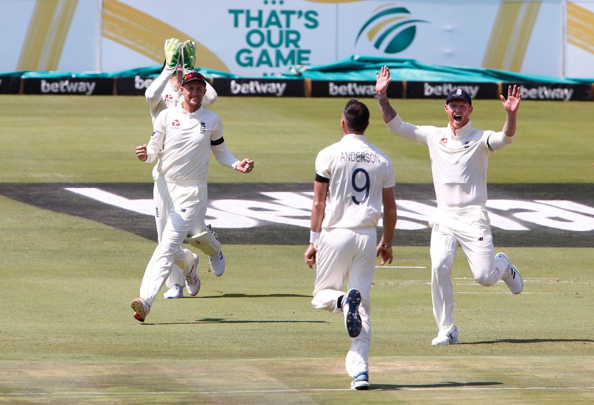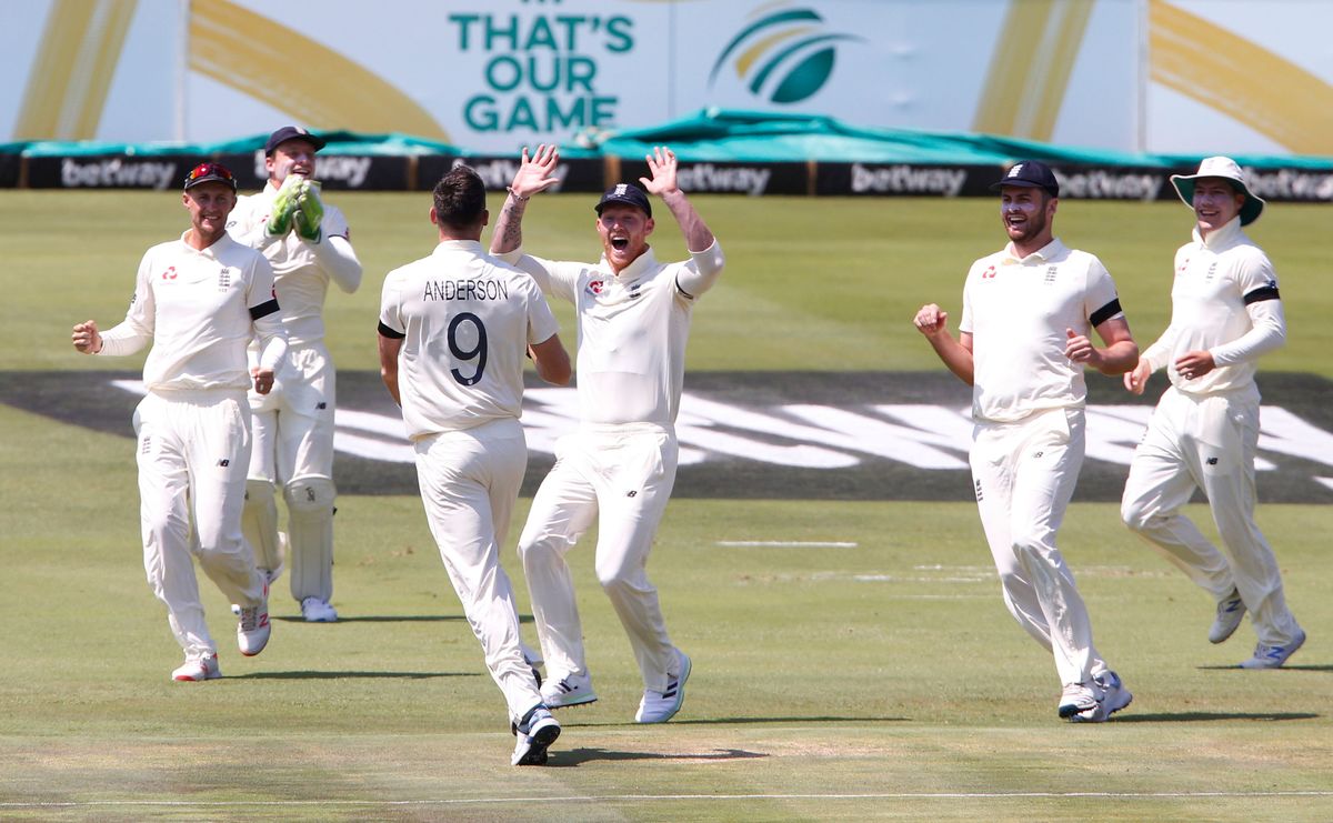 Cricket - South Africa v England - First Test - SuperSport Park Cricket Stadium, Centurion, Pretoria, South Africa - December 26, 2019 England's James Anderson celebrates taking the wicket of South Africa's Dean Elgar, caught by England's Jos Buttler with Ben Stokes and teammates REUTERS/Rogan Ward