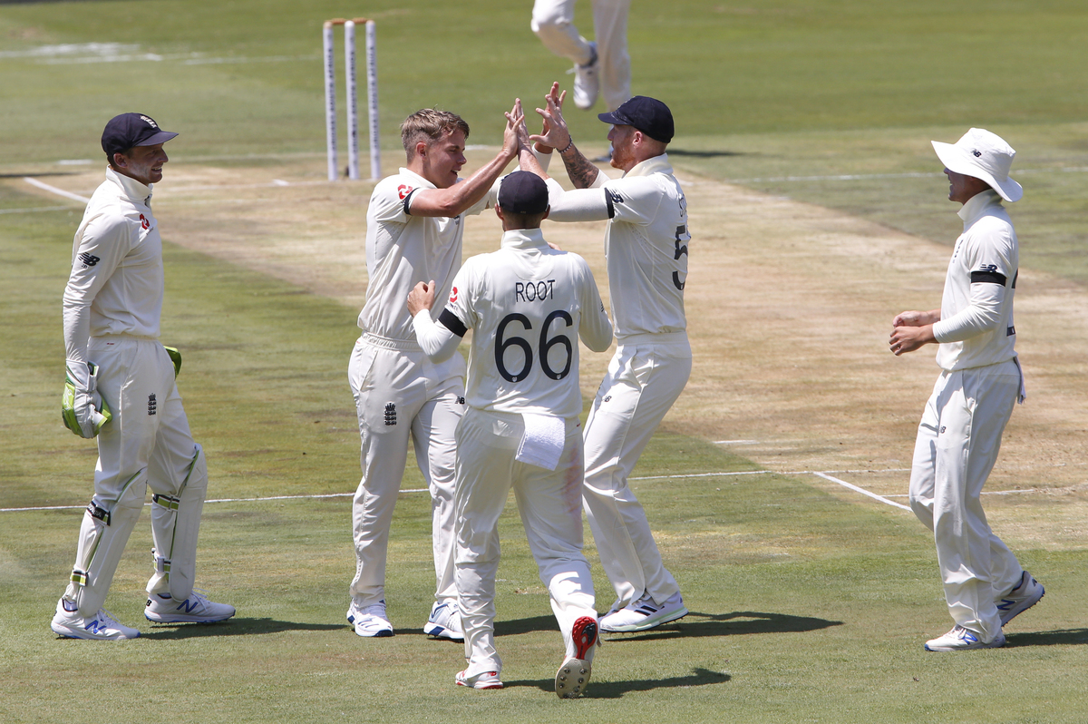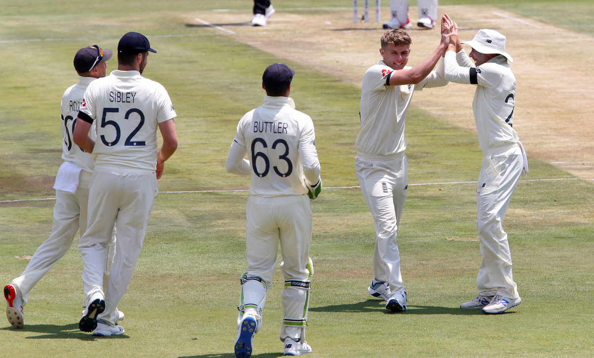 Cricket - South Africa v England - First Test - SuperSport Park Cricket Stadium, Centurion, Pretoria, South Africa - December 26, 2019 England's Sam Curran celebrates taking the wicket of South Africa's Aiden Markram with teammates REUTERS/Rogan Ward