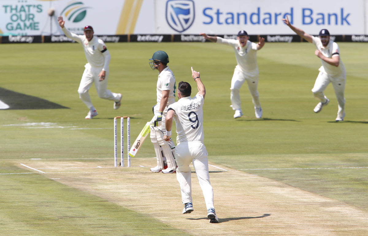 James Anderson marked his 150th cap and return to the England attack with the first-ball wicket of opener Dean Elgar, setting the tourists up for early domination of an inexperienced home side seeking to halt a run of five successive test defeats.