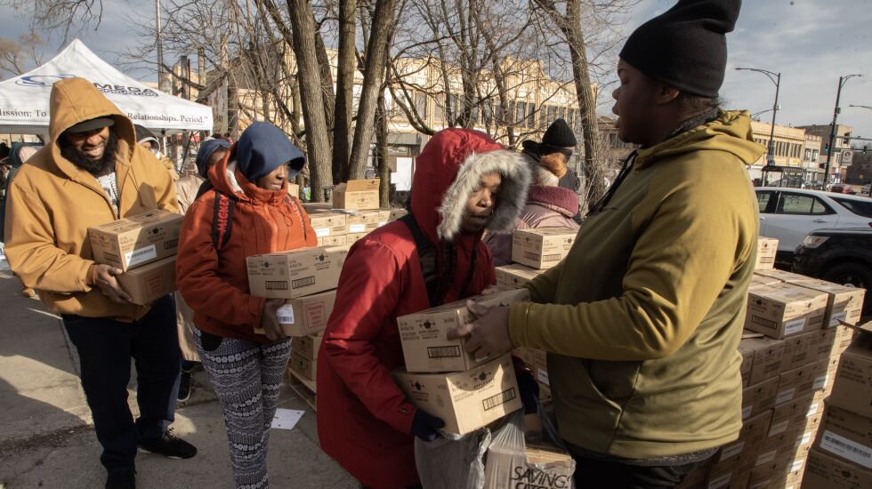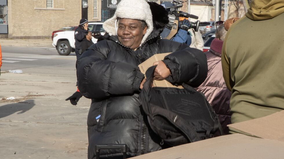 Charlotte Woods braved cold weather for over an hour Monday morning at an Englewood lot for a chance to receive a free box of frozen meat.