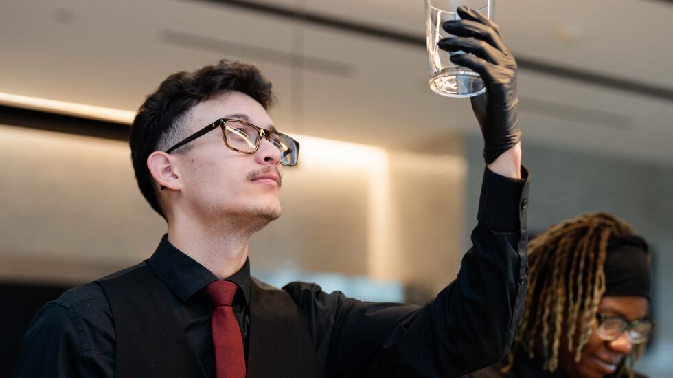 As Charles Cruz, 22, prepared for lunch service at the Hyatt on Oct. 18, he held a cup against the light above him, looking for blemishes. Once he saw which portions of the cup had water stains, he used a damp towel to clean them off.