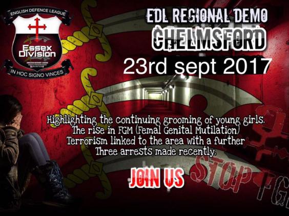 The group’s Essex division claimed it called the protest to highlight issues including grooming gangs, female genital mutilation and terror arrests.