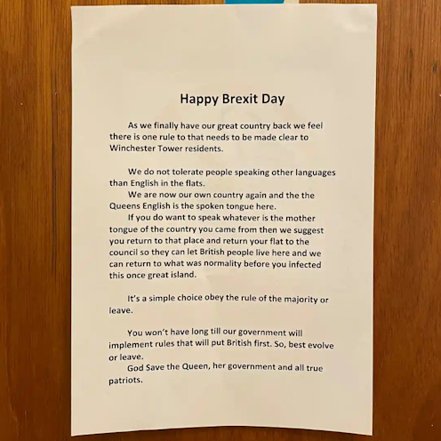 On the day that the UK left the European Union, a badly punctuated anonymous note was pinned to doors on the Winchester Tower block of flats in the city of Norwich, in the east of England. The message was directed at residents from abroad who had “infected this once great island”, informing them: “We do not tolerate people speaking other languages than English in the flats”, and that they should “obey the rule of the majority or leave”.