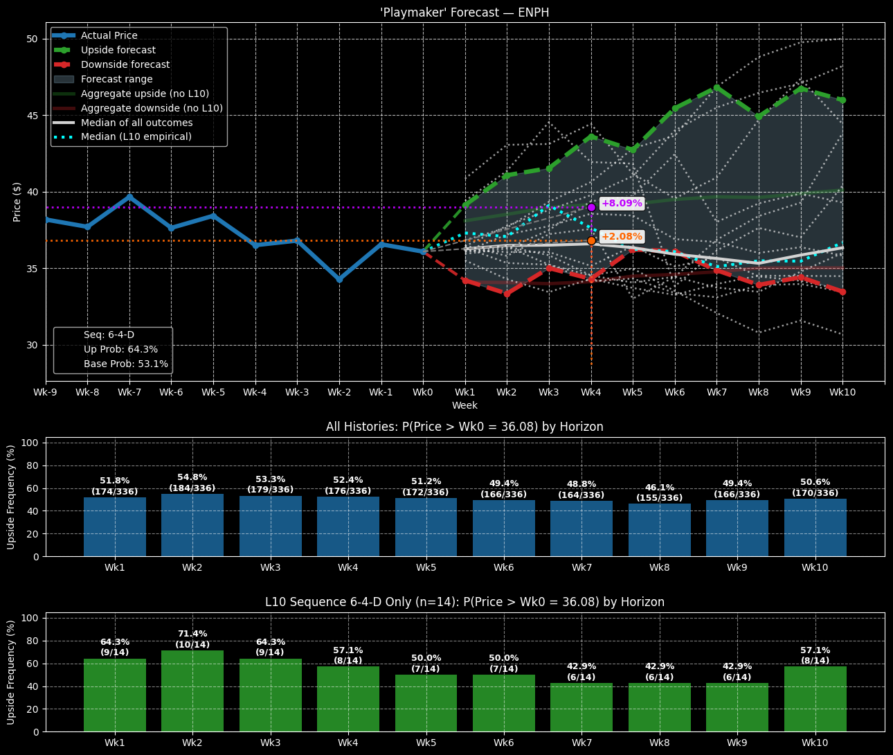 Under baseline conditions, the forward 10-week outcome of ENPH stock would be expected to have an overall slightly bullish bias. Further, prices would be expected to cluster around $36.40, assuming an anchor price of $36.08.
