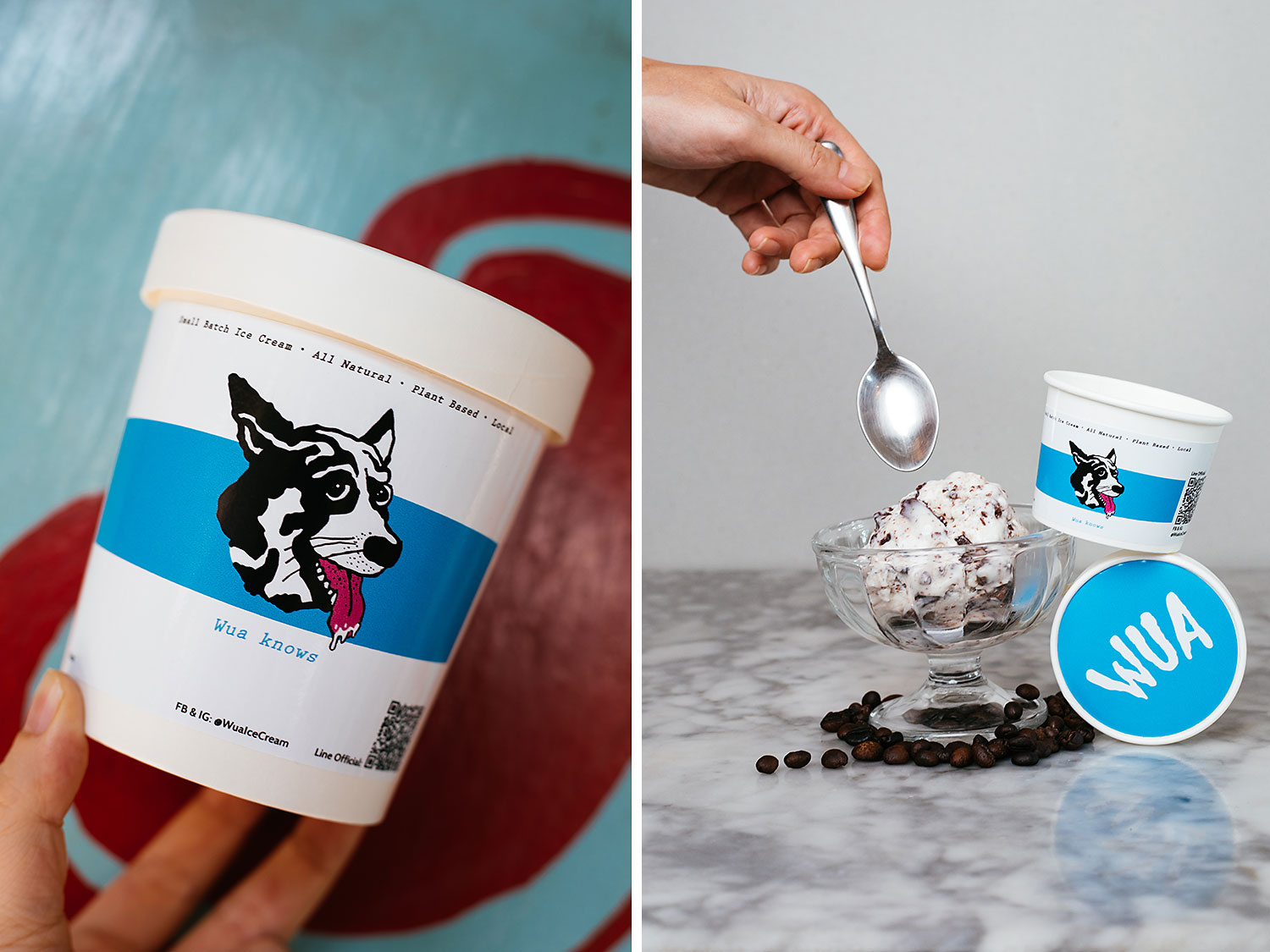 "The name 'Wua' is a bit of an inside joke. My wife, Napanarit 'Butter' Savantrach and I had a dog named Wua, which means cow in Thai. If you were drunk enough at Jam, you'd maybe mistake him for a small cow, as he had similar markings," says Ho. Wua the dog is now the face of the ice cream and adorns all the packaging.