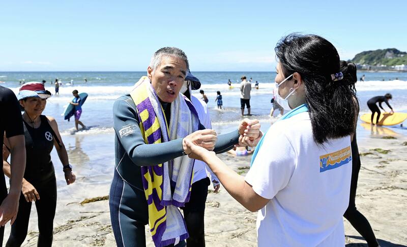 It is mid-July at Yuigahama Beach in Kamakura, Kanagawa Prefecture. Kawana, 64, suffers from early onset dementia, and a volunteer from a group dedicated to helping the physically and mentally disadvantaged to enjoy sports is encouraging him as he tries surfing, an activity of his youth.