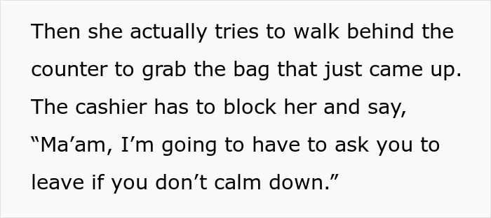 So the guy, of course, refused—and then this lady, obviously, decided to “take hers” by force. She rushed to the counter and tried to grab the bag with the already prepared order of the original poster. The cashier had to intervene and seriously declare that if she didn’t calm down, she would be asked to leave.