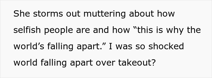 The original poster says that the woman then just stormed out, muttering to herself that the people around her have become incredibly selfish, and that it’s because of people like them that “the world’s falling apart.” As for our hero, he was left with his yummy food—to philosophically ponder how a failed attempt to take his order could actually contribute to the decline of the entire world…