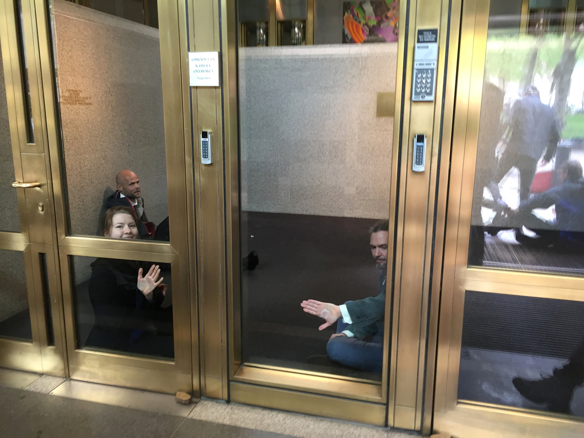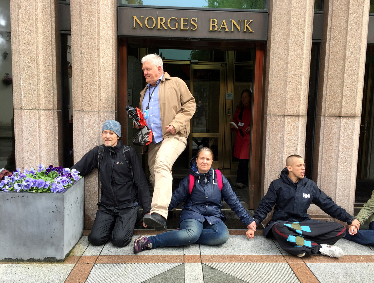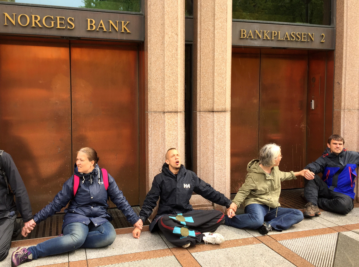 Around 10 demonstrators blocked the main entrance to Norges Bank and its asset management arm NBIM, carrying banners and spray-painting slogans on windows.