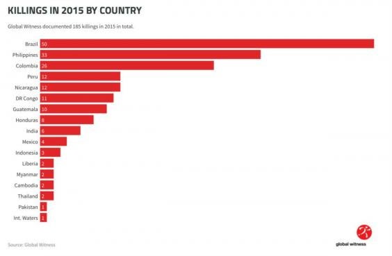 The report by Global Witness, an environmental and human rights watchdog, said it had recorded a total of 185 killings across 16 countries in 2015. This marked an increase of 59 per cent from 2014, and was the highest figure since the group began collating data in 2002.