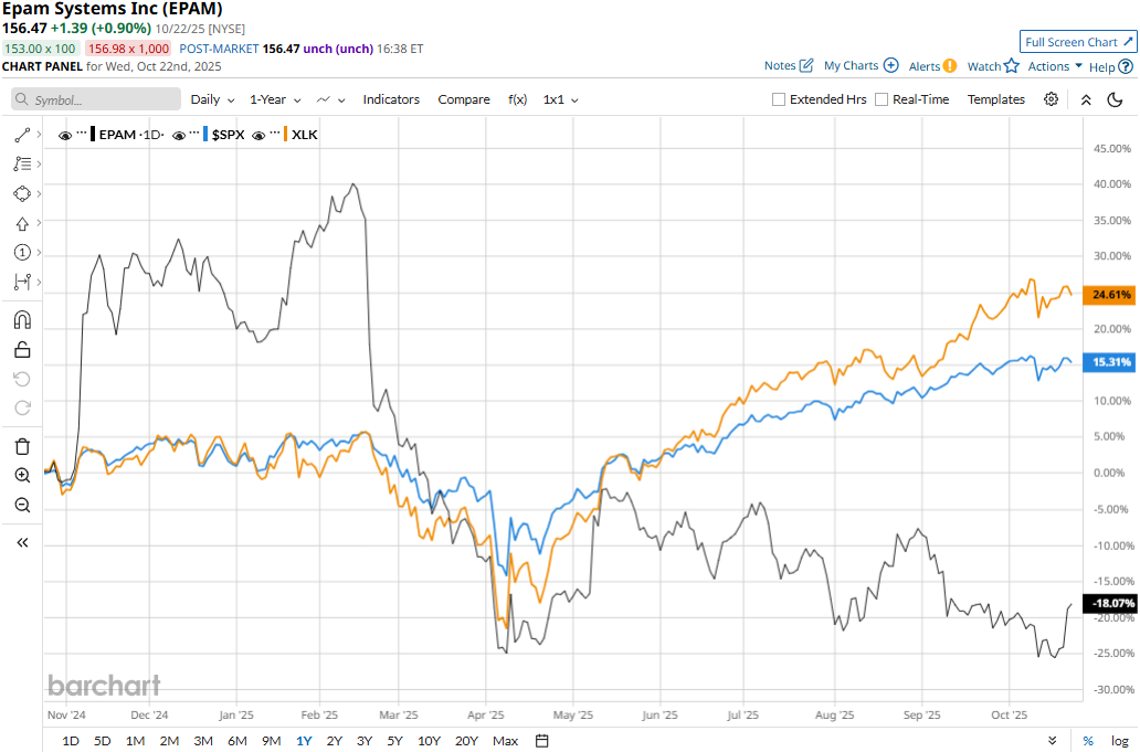 EPAM stock prices have plunged 21% over the past 52 weeks, notably underperforming the Technology Select Sector SPDR Fund’s (XLK) 23.2% gains and the S&P 500 Index’s ($SPX) 14.5% returns during the same time frame.