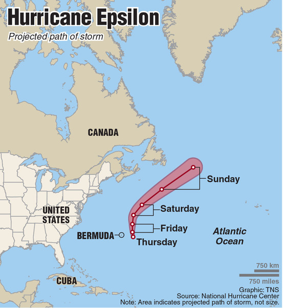 On the forecast track, the center of Epsilon is expected to make its closest approach to Bermuda, east of the island, Thursday afternoon or Thursday evening. The storm is expected to be a strong Category 3 hurricane at that time with maximum sustained winds of 115 mph, according to the hurricane center.