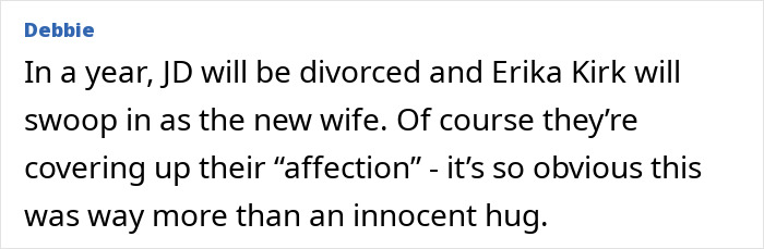 “JD is her ticket.” Kirk’s detractors kept sharing new rumors about the hug